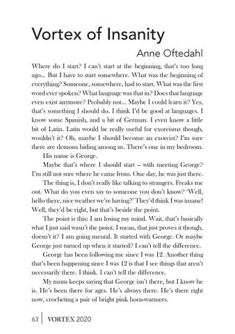 Vortex of Insanity Anne Oftedahl Where do I start? I can’t start at the beginning, that’s too long ago… But I have to start somewhere. What was the beginning of everything? Someone, somewhere, had to start. What was the first word ever spoken? What language was that in? Does that language even exist anymore? Probably not… Maybe I could learn it? Yes, that’s something I should do. I think I’d be good at languages. I know some Spanish, and a bit of German. I even know a little bit of Latin. Latin would be really useful for exorcisms though, wouldn’t it? Oh, maybe I should become an exorcist? I’m sure there are demons hiding among us. There’s one in my bedroom. His name is George. Maybe that’s where I should start – with meeting George? I’m still not sure where he came from. One day, he was just there. The thing is, I don’t really like talking to strangers. Freaks me out. What do you even say to someone you don’t know? ‘Well, hello there, nice weather we’re having?’ They’d think I was insane! Well, they’d be right, but that’s beside the point. The point is this: I am losing my mind. Wait, that’s basically what I just said wasn’t the point. I mean, that just proves it though, doesn’t it? I am going mental. It started with George. Or maybe George just turned up when it started? I can’t tell the difference. George has been following me since I was 12. Another thing that’s been happening since I was 12 is that I see things that aren’t necessarily there. I think. I can’t tell the difference. My mum keeps saying that George isn’t there, but I know he is. He’s been there for ages. He’s always there. He’s there right now, crocheting a pair of bright pink horn-warmers. 63