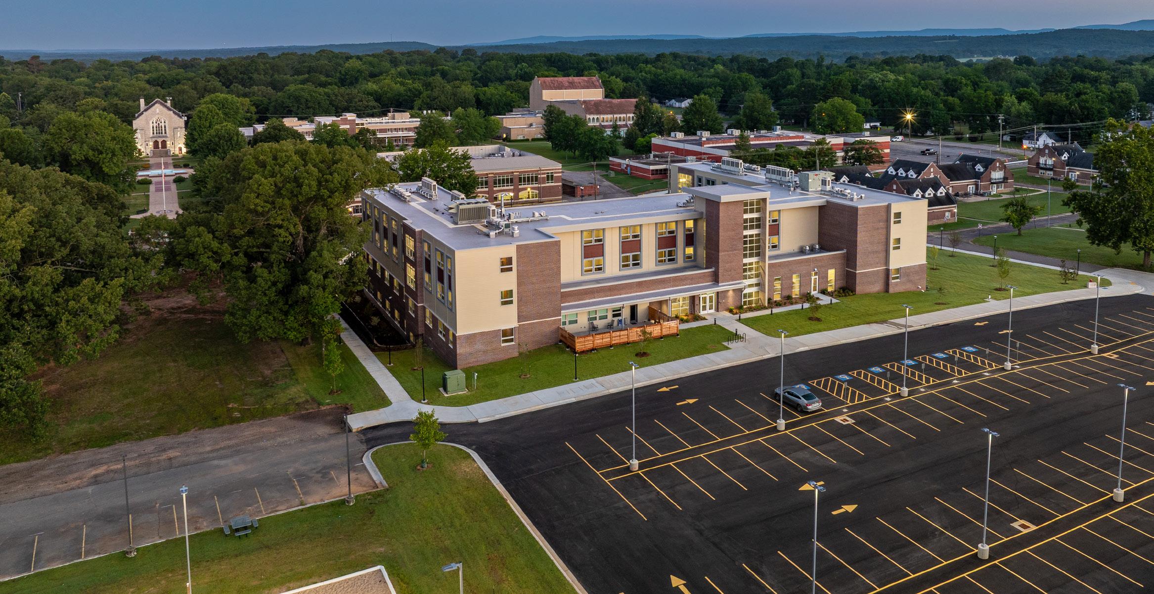Aerial view of the New Student Residence Hall that opened for the 2025 Fall Semester. (Ken West Photography)
