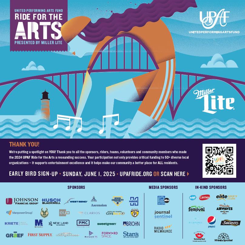 Your generous support of the United Performing Arts (UPAF) through the UPAF Ride for the Arts will have a profound impact on our community, fostering a vibrant cultural landscape that enriches lives and stimulates economic growth. Your gift nurtures creativity, drives inspiration and enhances the overall quality of life in Southeastern Wisconsin.