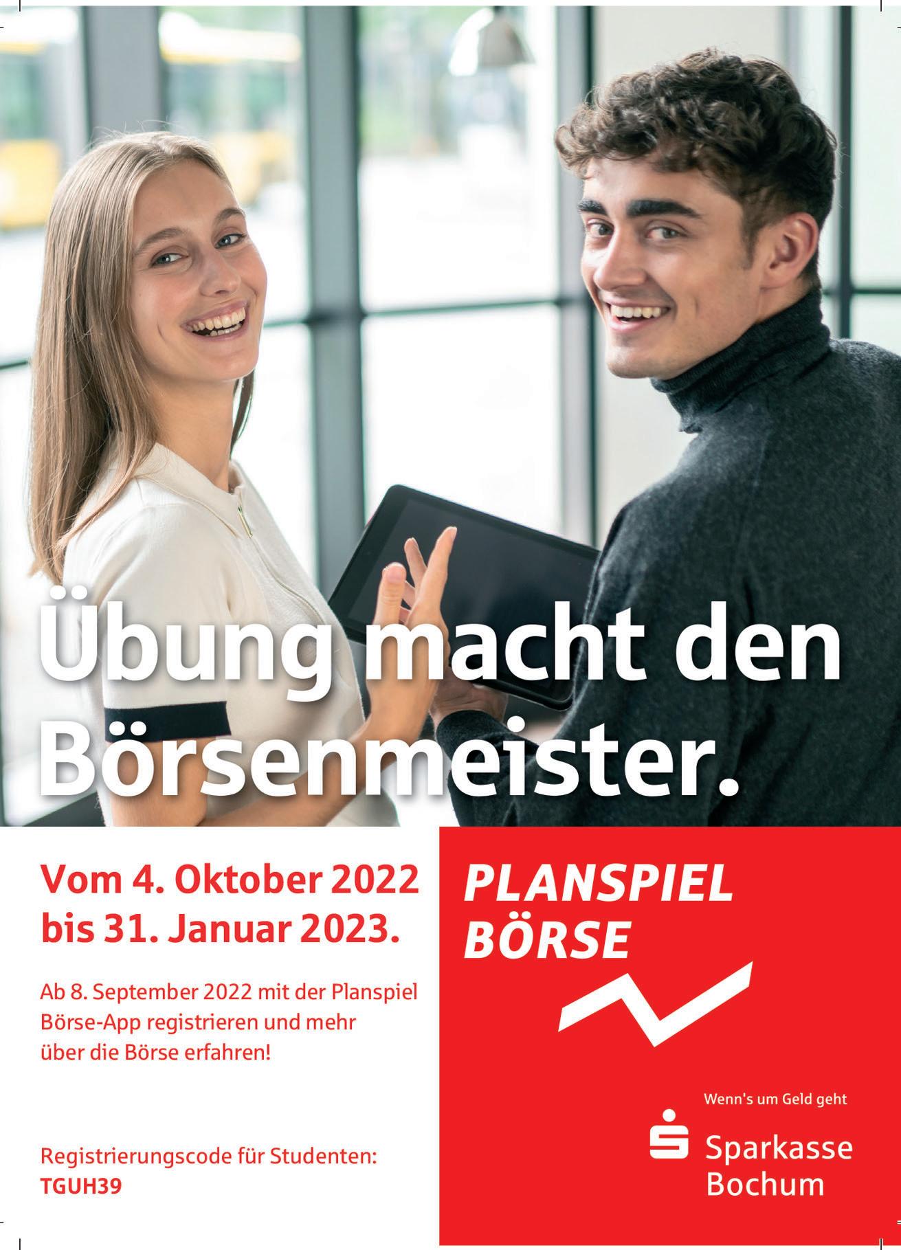 Die Anmeldung zum Planspiel Börse Plus ist ab dem 01. September möglich; am 30. geht es offiziell los. Am 09. Dezember schließt die Börse. Studierende können zur Registrierung den Code StudentenSpBochum20! nutzen; die entsprechenden Formulare und alle weiteren Infos gibt’s unter: www.planspiel-boerse.de!