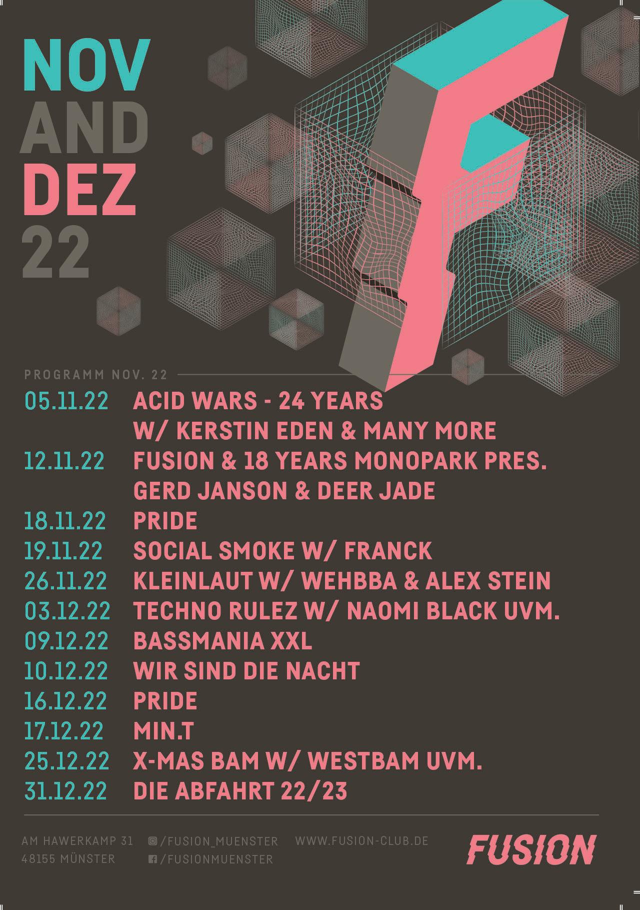 Die Nightlife-Geschichte des ursprünglichen Industriegebäudes lässt sich bis in die späten Achtziger zurückverfolgen und wird seit Ende letzten Jahres um ein brandneues Kapitel ergänzt: In Zusammenarbeit mit Rob Protzmann und Chris Moylan hat sich der Fusion Club einer umfassenden Frischzellenkur unterzogen, um geschmackvollen Nachteulen auch in den nächsten Dekaden ein würdiges Umfeld zu bieten. Wer es auf die Probe stellen möchte, muss auf attraktive Chancen nicht lange warten: November-Highlight ist der 18. Geburtstag von Monopark; ein Brand, der mitsamt seiner Partyreihe zu den wichtigsten Formaten der Fusion-Geschichte zählt. Die prestigeträchtige Headliner-Position teilen sich am Sa., 12. November Gerd Janson und Deer Jade, die beide ihre Premiere im Club feiern und zum Anlass ihre Interpretation von House und Melodic Techhouse vorstellen.