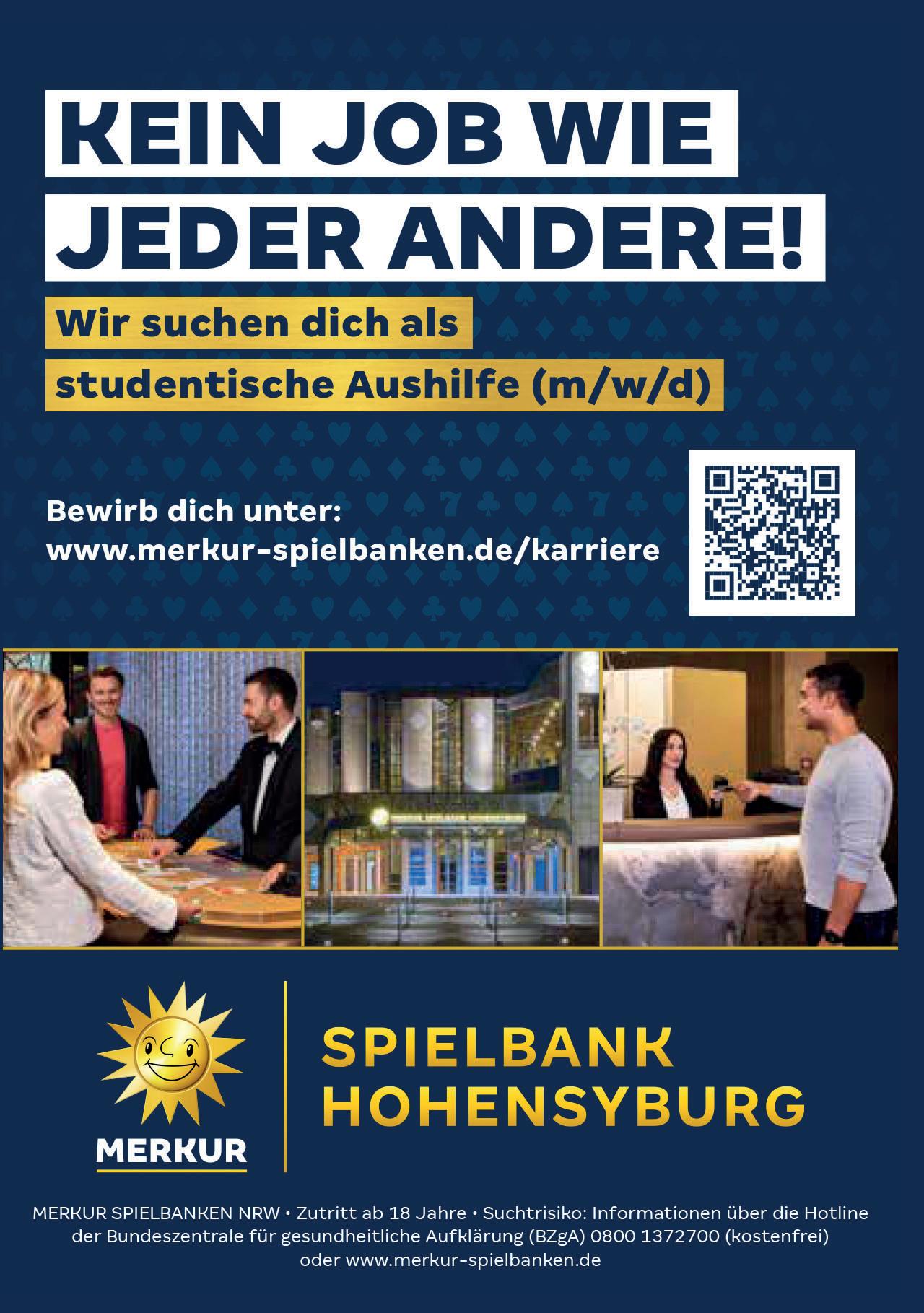 Wer aktuell auf der Suche nach einem spannenden Aushilfsjob ist, der sich hervorragend mit dem Studentenalltag vereinbaren lässt, ist bei der MERKUR SPIELBANK Hohensyburg an der richtigen Adresse: Das Team vor Ort freut sich auf engagierte neue Kolleginnen und Kollegen, die bereit dazu sind, in einem nicht alltäglichen Beruf und einem außergewöhnlichen Umfeld zu arbeiten.