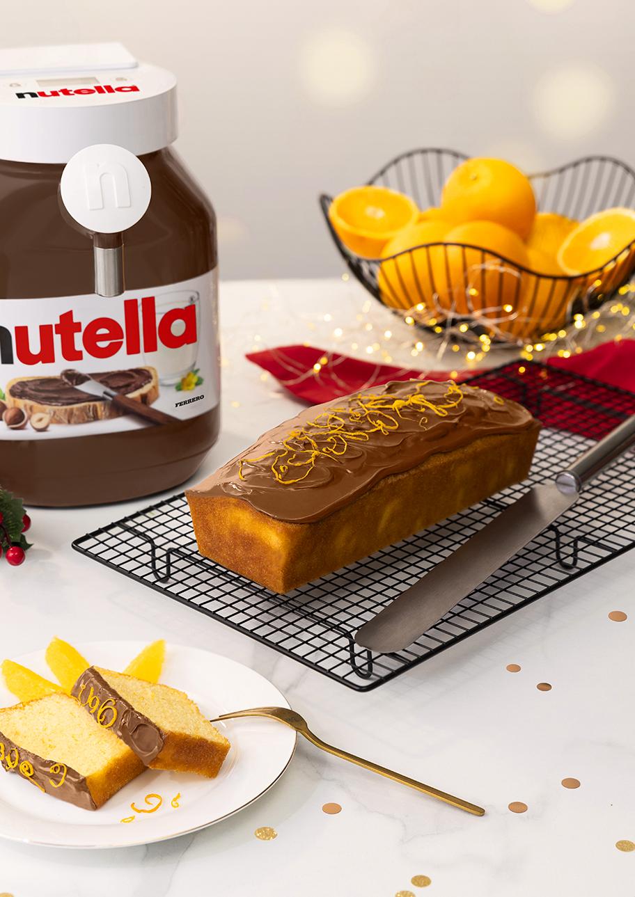 8. Using the electronic dispenser and a spatula, spread the Nutella® all over the cake and place a few orange peels on top.