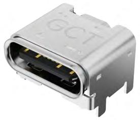 Note also that GCT ports come in several installation variants, which ensures space savings inside device enclosures (or on a PCB). The most typical connector format is designed for SMT assembly, although usually also incorporating THT shell stakes to improve the mounting stability of the entire component. Moreover, the product range also includes models with both surface-mounted leads and shell stakes (Fully SMT). The third variant facilitates installing the components in such a manner that the connector symmetry axis overlaps with the PCB cross-section, known as a Mid-mount configuration. The connector is placed in a laminate slot to obtain an ultra-low circuit profile being a perfect solution for the design of smartphones, tablets, games consoles, smart watches and other hardware in which, literally, every cubic millimetre of internal space counts. GCT USB Type C products are also available in vertical versions (in relation to a PCB), used for example, in docking stations, certain charger types, etc.