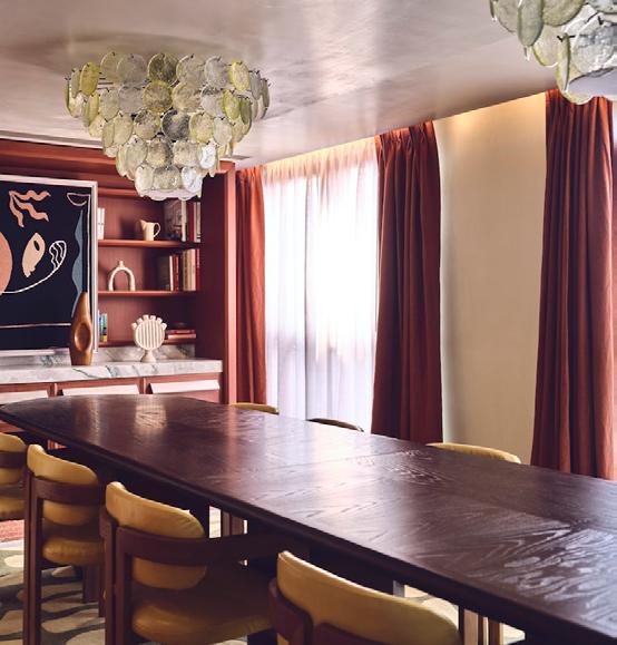 lines, glazed tiles, and tactile fabrics. Through her selection of materials and variety of finishes, Boronkay infuses the interiors with energy and creativity. The yoga studio uses soft woods, combined with rich fabrics to create a relaxing feel and the shared dining space incorporates ornate fittings and marbles, combined with subtle textiles in contrasting shades.
