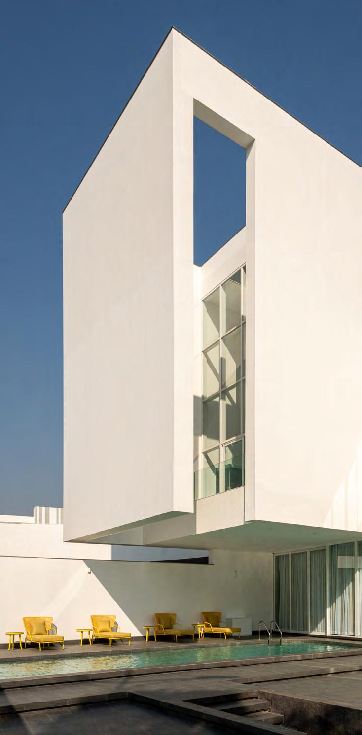 The outdoor space includes a long rectangular swimming pool that runs alongside the villa. The pool area is surrounded by a spacious deck, perfect for leisure and relaxation. Bright yellow lounge chairs line the poolside, adding a vibrant touch to the otherwise monochromatic color scheme of the building. The open design and natural light create a bright and airy atmosphere inside the villa, further enhancing the connection with nature.