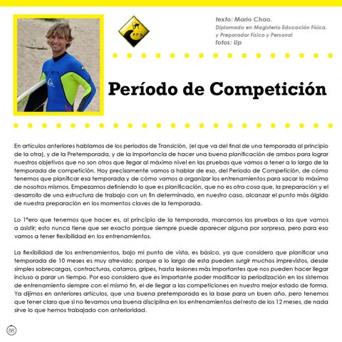 Período de Competición En artículos anteriores hablamos de los periodos de Transición, (el que va del final de una temporada al principio de la otra), y de la Pretemporada, y de la importancia de hacer una buena planificación de ambos para lograr nuestros objetivos que no son otros que llegar al máximo nivel en las pruebas que vamos a tener a lo largo de la temporada de competición. Hoy precisamente vamos a hablar de eso, del Periodo de Competición, de cómo tenemos que planificar esa temporada y de cómo vamos a organizar los entrenamientos para sacar lo máximo de nosotros mismos. Empezamos definiendo lo que es planificación, que no es otra cosa que, la preparación y el desarrollo de una estructura de trabajo con un fin determinado, en nuestro caso, alcanzar el punto más álgido de nuestra preparación en los momentos claves de la temporada. Lo 1ºero que tenemos que hacer es, al principio de la temporada, marcarnos las pruebas a las que vamos a asistir; esto nunca tiene que ser exacto porque siempre puede aparecer alguna por sorpresa, pero para eso vamos a tener flexibilidad en los entrenamientos. La flexibilidad de los entrenamientos, bajo mi punto de vista, es básico, ya que considero que planificar una temporada de 10 meses es muy atrevido; porque a lo largo de esta pueden surgir muchos imprevistos, desde simples sobrecargas, contracturas, catarros, gripes, hasta lesiones más importantes que nos pueden hacer llegar incluso a parar un tiempo. Por eso considero que es importante poder modificar la periodización en los sistemas de entrenamiento siempre con el mismo fin, el de llegar a las competiciones en nuestro mejor estado de forma. Ya dijimos en anteriores artículos, que una buena pretemporada es la base para un buen año, pero tenemos que tener claro que si no llevamos una buena disciplina en los entrenamientos del resto de los 12 meses, de nada sirve lo que hemos trabajado con anterioridad. 88
