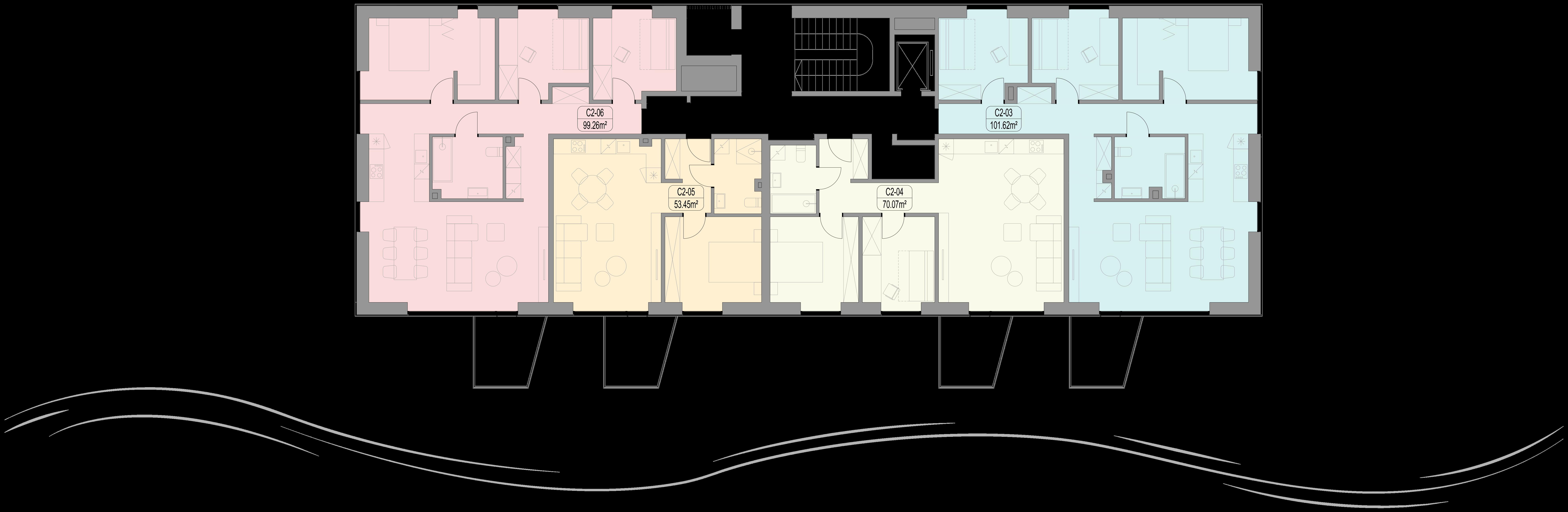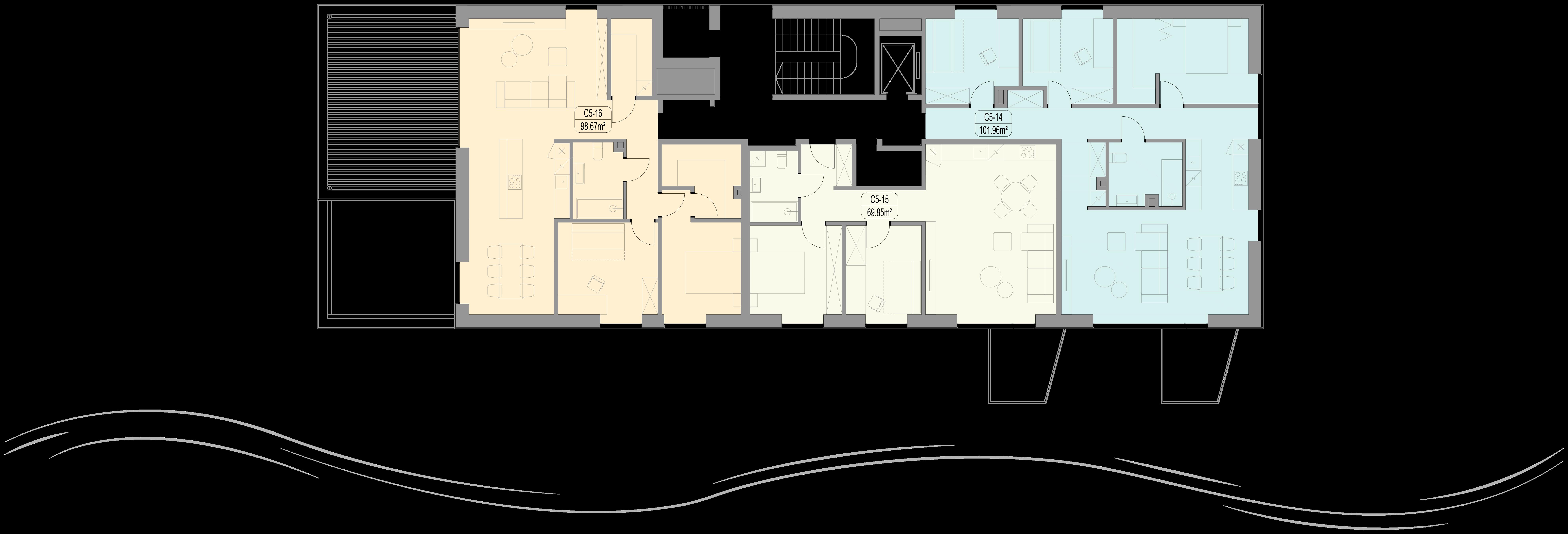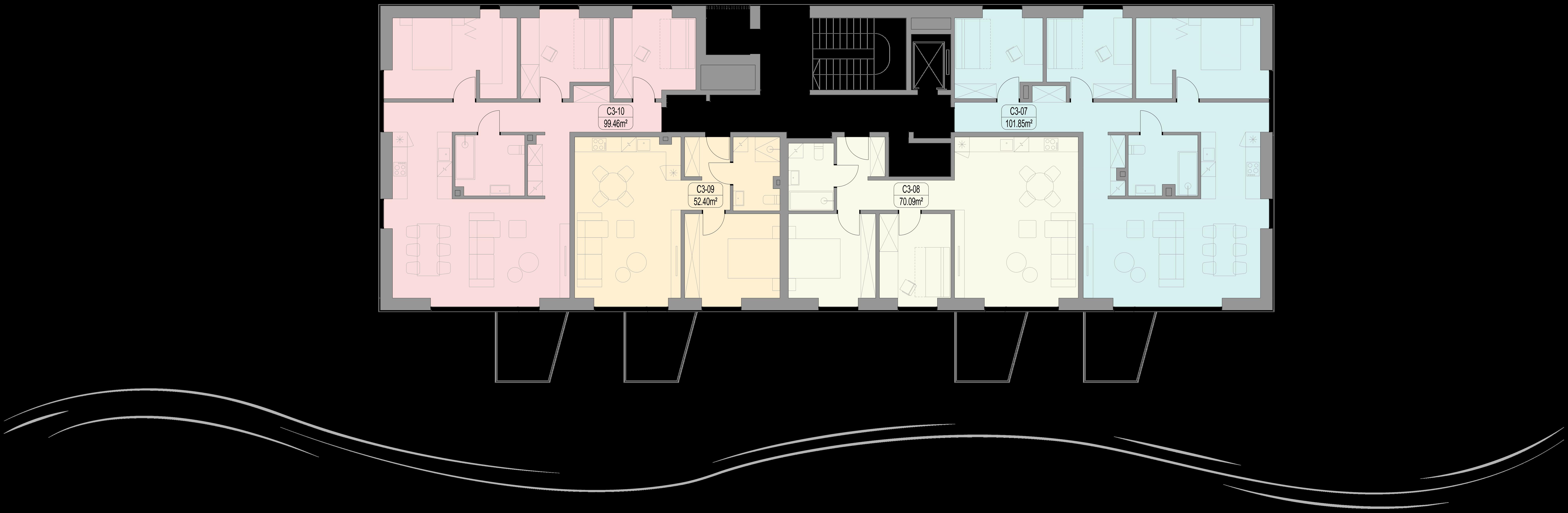 proc. apartamentų yra didesni nei 90 kv. m. Projekto architektai suplanavo apartamentus taip, kad be išimties visi gyventojai pro savo svetainės