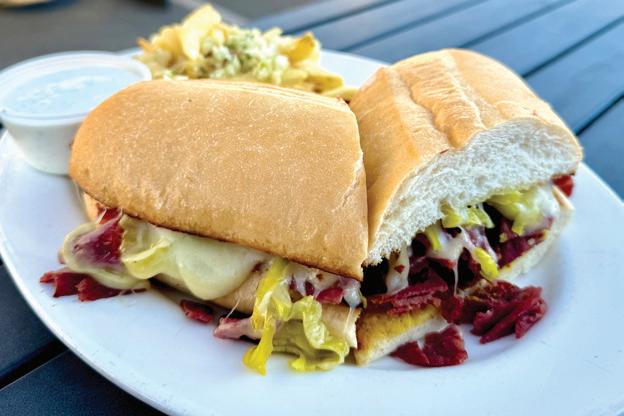Excellent, friendly service is only so much when it comes to satisfying the visitors of a town bar and grill. Consistently delicious food is a must, and the menu at Quackers is full of favorites sure to keep visitors coming back for more. This loaded pastrami sandwich brings salt from the quality sliced meat and gooey melted cheese, tang from the mustard and pepperoncini slices, and a lightly crunchy texture from the toasted baguette. Add their garlic fries for the full experience.