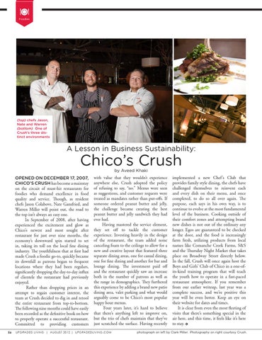 implemented a new Chef ’s Club that provides family style dining, the chefs have challenged themselves to reinvent each and every dish on their menu, and once completed, to do so all over again. The purpose, each says in his own way, is to continue to evolve at the most fundamental level of the business. Cooking outside of their comfort zones and attempting brand new dishes is not out of the ordinary any longer. Egos are guaranteed to be checked at the door, and the food is increasingly farm fresh, utilizing products from local names like Comanche Creek Farms, S&S and the Thursday Night Market that takes place on Broadway Street directly below. In the fall, Crush will once again host the Boys and Girls’ Club of Chico in a one-ofits-kind training program that will teach the youth how to operate in a fast-paced restaurant atmosphere. If you remember from our earlier writeup, last year was a complete success, and we’re positive this year will be even better. Keep an eye on their website for dates and times. It is clear from even the most fleeting of visits that there’s something special in the air here, and this time, it feels like it’s here to stay.