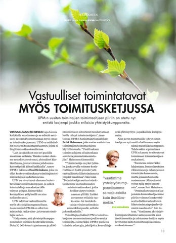 sekä yhteisyritys- ja paikallisia kumppaprosenttia on sitoutunut noudattamaan neita. heille tehtyä toimintaohjetta”, tausAlun perin toimittajille tehty toimintoittaa UPM:n hankintaketjupäällikkö taohje on nyt uusittu kattamaan myös Petri Heinonen, joka vastaa uudistetun nämä muut liikekumppanit. toimittajien toimintaohjeen Tehdessään sopimuksen käyttöönotosta. ”Uusittuakaan UPM:n kanssa he sitoutuvat toimintaohjetta ei kuitenkaan toimimaan toimintaohjeen sovelleta pienmetsänomistamukaisesti. jiin”, Heinonen täsmentää. ”Suomessa esimerkiksi ”Toimintaohje on yksi työkalahjontaan, ihmisoikeuksien lu, jonka avulla voimme konkrikkomiseen ja rahanpesuun reettisesti lisätä ymmärrystä törmätään harvemmin, vastuullisesta liiketoiminnasta mutta joissain toimintaympäri maailmaa”, hän lisää. ”Vaadimme maissamme tällaiset asiat ”Toimintaohje asettaa toimityhteistyökump- voivat tulla eteen useamtajillemme vastuullisuuden min”, sanoo Essi Heinänen. minimivaatimukset, jotka paneiltamme ”Ottamalla toimijoita laaheidän täytyy toiminsamoja asioita jemmin toimintaohjeemme nassaan ylittää. Lisäksi piiriin voimme konkreettiasetamme erilaisia raakuin itseltämsesti edistää vastuullisten ka-aine- tai tuotekohmekin.” liiketoimintatapojen leviätaisia erityisvaatimuksia ESSI HEINÄNEN mistä maailmalla”, hän toesimerkiksi puulle, sellulle teaa. ”Vaadimme yhteistyöja kemikaaleille.” kumppaneiltamme samoja asioita kuin Toimittajien lisäksi UPM:n toimitusitseltämmekin ja odotamme heidän myös ketjussa on moninainen joukko muita levittävän näitä toimintatapoja omissa toimijoita, esimerkiksi UPM:n puolesta toimivia edustajia, jakelijoita, konsultteja verkostoissaan.”