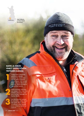 MATIN JA EERON VINKIT YHTEISTYÖHÖN YRITTÄJIEN KANSSA Yrittäjä toimii metsässäsi pykälien ja ohjeiden mukaan. Tuo siis toiveesi selvästi esille jo kaupantekovaiheessa, niin ne ovat töiden alkaessa tekijän työohjeissa. Käytä tarvittaessa asiantuntijaa apuna. Tarkat työohjeet ovat erityisen tarpeen silloin, kun töitä tehdään pihapiirien, rantojen ja muiden tärkeiden näkymien lähellä. Jos tulet käymään työmaalla, kannattaa ajoittaa käynti heti töiden alkuun. Muista turvallisuus: soita koneelle ennen tuloasi ja käytä huomioliiviä.
