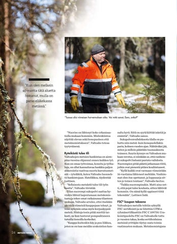 ”Kun olen melkein 40 vuo a tätä alue a hoitanut, mulla on paras eläkekassa metässä.” ”Tuossa olisi viimeisen harvennuksen aika. Vai mitä sanot, Eero, onko?”