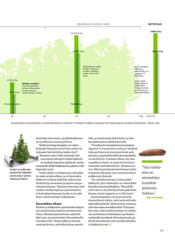 tään, ja asiantuntija laatii hoito- ja hakkuuehdotukset kullekin kuviolle. ”Tavallisesti metsänhoitosuositukset ohjaavat 3–4 prosentin tuottoon. Etelässä toki puut kasvavat paremmin kuin pohjoisessa, ja paikallisestikin kasvupaikalla on merkitystä. Toisaalta silloin, kun kasvupaikka on hyvä, on myös investoitava enemmän metsänhoitoon”, Hynynen sanoo. Hän kannustaa kuuntelemaan asiantuntijoita silloinkin, kun omat tavoitteet poikkeavat yleisistä. ”Jos metsänomistaja ei halua päätehakkuuta, yksi vaihtoehto on esimerkiksi kuusikon poimintahakkuu. Taloudellisesti tulos ei ole yhtä hyvä kuin päätehakkuussa, mutta tappiota se ei silti tuota.” Asiantuntijoiden arviot perustuvat luonnollisesti siihen, mitä metsistä tiedetään tällä hetkellä. Mutta miten varautua tulevaisuuden markkinoihin? Hynynen korostaa, että metsänomistaja voi vaikuttaa myönteiseen kehitykseen parhaiten vaalimalla metsänsä elinvoimaisuutta ja hyvää kasvukuntoa aina taimikonhoidosta hakkuisiin asti.