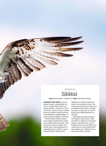 KUVA JARI NISKANEN / VASTAVALO.FI TEKSTI JUHA-MATTI VALONEN AURINGON VIIME SÄTEET punaavat pienen lammen rantamäntyjen latvat, kun lampea kohti liitää suuri, vaalea petolintu. Se laskeutuu isoon risulinnaan männyn latvassa. Sääksikoiras on lentänyt tuhansia kilometrejä palatakseen pesäpaikalleen yli puolivuotiselta matkaltaan Afrikasta. Aamulla sääksi lähtee saalistamaan tutuille sulapaikoille ja palaa pian pesälle lahna kynsissään. Pesä on pysynyt asuttuna useiden sukupolvien ajan, koska pesämänty on vankkalatvainen ja sieltä on hyvät näkymät kaikkiin ilmansuuntiin.