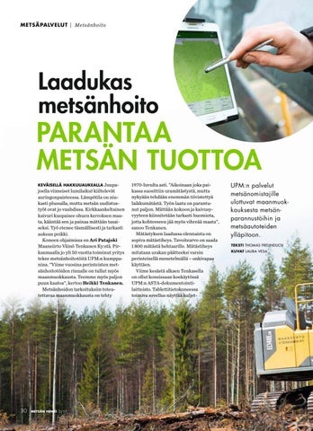 PARANTAA METSÄN TUOTTOA KEVÄISELLÄ HAKKUUAUKEALLA Juupajoella viimeiset lumilaikut kiiltelevät auringonpaisteessa. Lämpötila on niukasti plussalla, mutta metsän uudistustyöt ovat jo vauhdissa. Kirkkaankeltainen kaivuri kuopaisee ohuen kerroksen maata, kääntää sen ja painaa mättään tasaiseksi. Työ etenee täsmällisesti ja tarkasti aukean poikki. Koneen ohjaimissa on Ari Patajoki Maansiirto Väinö Tenkanen Ky:stä. Pirkanmaalla jo yli 50 vuotta toiminut yritys tekee metsänhoitotöitä UPM:n kumppanina. ”Viime vuosina perinteisten metsänhoitotöiden rinnalle on tullut myös maanmuokkausta. Teemme myös paljon puun kaatoa”, kertoo Heikki Tenkanen. Metsänhoidon tarkoituksiin toteutettavaa maanmuokkausta on tehty