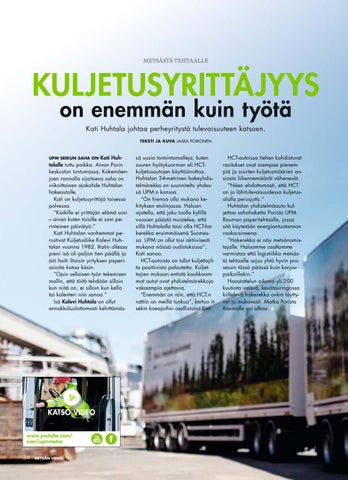 sä uusia toimintamalleja, kuten suuren hyötykuorman eli HCTkuljetusautojen käyttöönottoa. Huhtalan 34-metrinen hakeyhdistelmärekka on suunniteltu yhdessä UPM:n kanssa. “On hienoa olla mukana kehityksen etulinjassa. Haluan ajatella, että joku tuolla kylillä vuosien päästä muistelee, että sillä Huhtalalla taisi olla HCT-hakerekka ensimmäisenä Suomessa. UPM on ollut tosi aktiivisesti mukana näissä uudistuksissa”, Kati sanoo. HCT-autoista on tullut kuljettajilta positiivista palautetta. Kuljettajien mukaan entistä kookkaammat autot ovat yhdistelmärekkoja vakaampia ajettavia. “Enemmän on niin, että HCT:n rattiin on meillä tunkua”, kertoo itsekin koeajoihin osallistunut Kati.