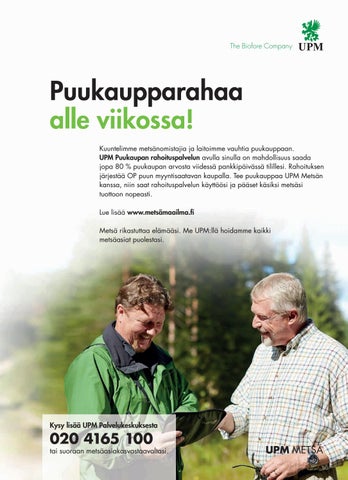 Puukaupparahaa alle viikossa! Kuuntelimme metsänomistajia ja laitoimme vauhtia puukauppaan. UPM Puukaupan rahoituspalvelun avulla sinulla on mahdollisuus saada jopa 80 % puukaupan arvosta viidessä pankkipäivässä tilillesi. Rahoituksen järjestää OP puun myyntisaatavan kaupalla. Tee puukauppaa UPM Metsän kanssa, niin saat rahoituspalvelun käyttöösi ja pääset käsiksi metsäsi tuottoon nopeasti. Lue lisää www.metsämaailma.fi Metsä rikastuttaa elämääsi. Me UPM:llä hoidamme kaikki metsäasiat puolestasi.