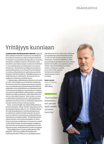 Yrittäjyys kunniaan SUOMALAISEN METSÄTALOUDEN PERUSTA lepää pitkälti yrittäjien hartioilla. Puutavaran autokuljetus, koneellinen puunkorjuu sekä metsänparannustyöt on hoidettu ensimmäisiä kokeiluja lukuun ottamatta itsenäisten yrittäjien toimesta. Nyttemmin myös itsenäisten palveluntarjoajien tuottamat metsänhoito- ja metsätalouden suunnittelutyöt ovat nopeassa kasvussa. Suomalainen yrittäjyyteen perustuva puunhankintaketju on osoittanut kansainvälisissä vertailuissa kilpailukykynsä sekä kustannustehokkuudessa että työn laadussa. Yrittäjäkuntamme on valikoitunutta ja valistunutta. He panostavat voimakkaasti toimintansa kehittämiseen. Urakanantajan näkökulmasta tärkeintä on huolehtia siitä, että yrittäjät saavat riittävästi etukäteisinformaatiota tulevista työkokonaisuuksista pystyäkseen suunnittelemaan ja ketjuttamaan koneiden ja kuljettajien työt mahdollisimman tehokkaasti sekä varmistamaan laadukkaan lopputuloksen. Yrittämisen puitteet määritellään urakanantajan ja yrittäjän välisissä yrittäjäsopimuksissa sekä niiden liitteenä olevissa palvelukuvauksissa. Työn laadun seuranta ja siihen liittyvä palautteenanto sekä palautteesta oppiminen puolin ja toisin on tuloksekas tapa parantaa työn tuottavuutta ja toiminnan laatua. Kone- ja autoyrittäjät ovat tärkeä linkki yhtiön ja metsänomistajien välissä. Heidän työpanoksensa on puunhankintaketjun näkyvin osa. Yrittäjän tekemä työ sekä kanssakäyminen metsänomistajan kanssa vaikuttavat paljolti metsänomistajien tyytyväisyyteen suhteessa solmimiimme puukauppoihin ja myymiimme metsäpalveluihin. Toimintaperiaatteisiimme kuuluu, että metsänomistajalla on oikeus tutustua korjuun ja kuljetusten etenemiseen, minkä vuoksi informoimme metsänomistajia ennakkoon operaatioiden aloittamisesta ja päättymisestä sekä työmaavierailun edellyttämistä turvallisuusohjeista. Tämä pääkirjoitus on minun jäähyväiseni teille lukijoille, sillä siirryn eläkkeelle kesällä 2017. Työskennellessäni UPM:n ja sen edeltäjäyritysten