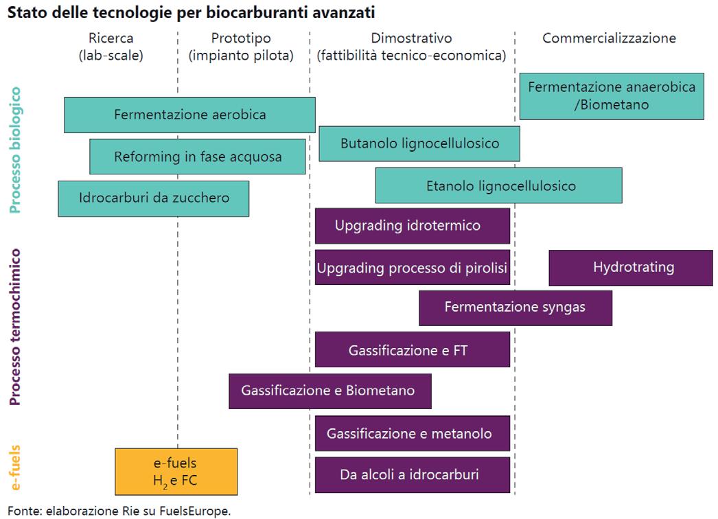 Un ultimo capitolo riguarda i carburanti rinnovabili di origine non biologica, in cui rientrano gli e-fuels che sono ottenuti dalla sintesi tra idrogeno (“verde” e“blu”), a sua volta prodotto tramite elettrolisi dell’acqua utilizzando elettricità da fonti rinnovabili ed anidride carbonica catturata