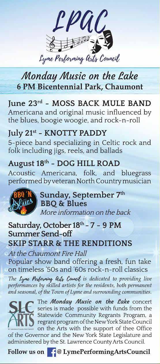 The Lyme Performing Arts Council’s Monday Music on the Lake concert series in Chaumont concludes on Aug. 18 with the band Doghill Road. All concerts in the series are free (donations accepted) and begin at 6:00 p.m. at Chaumont Village Beach, Rt. 12E (across from the Chaumont Fire Hall). Rain location is the Three Mile Bay Fire Hall, 8581 Rt. 12E. Food and beverages will be available for purchase, with proceeds benefiting the Three Mile Bay and Chaumont Volunteer Fire Departments.
