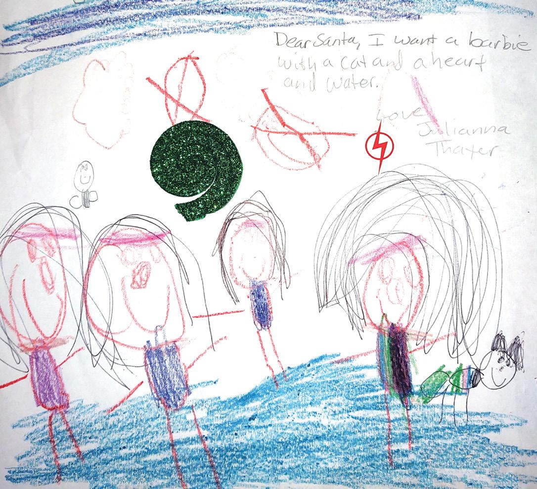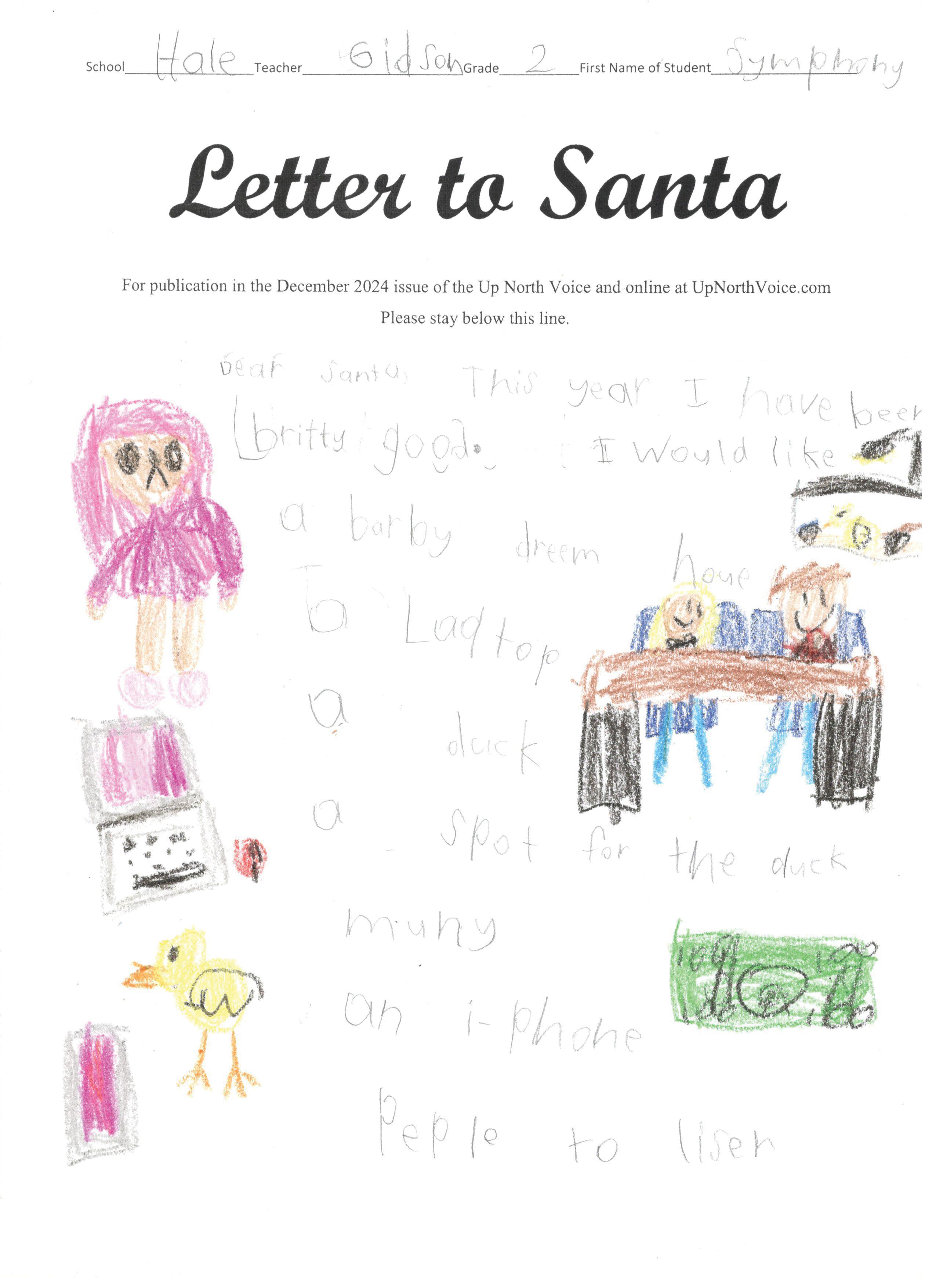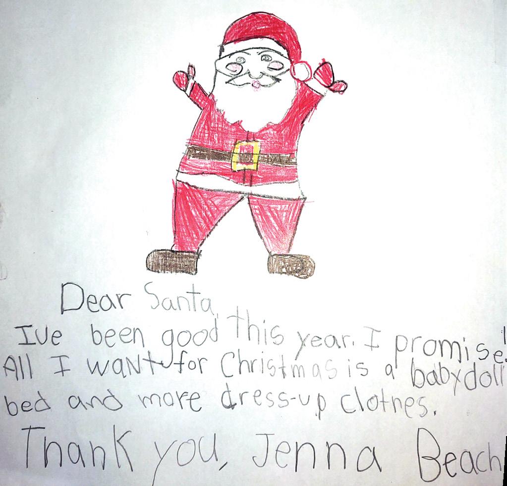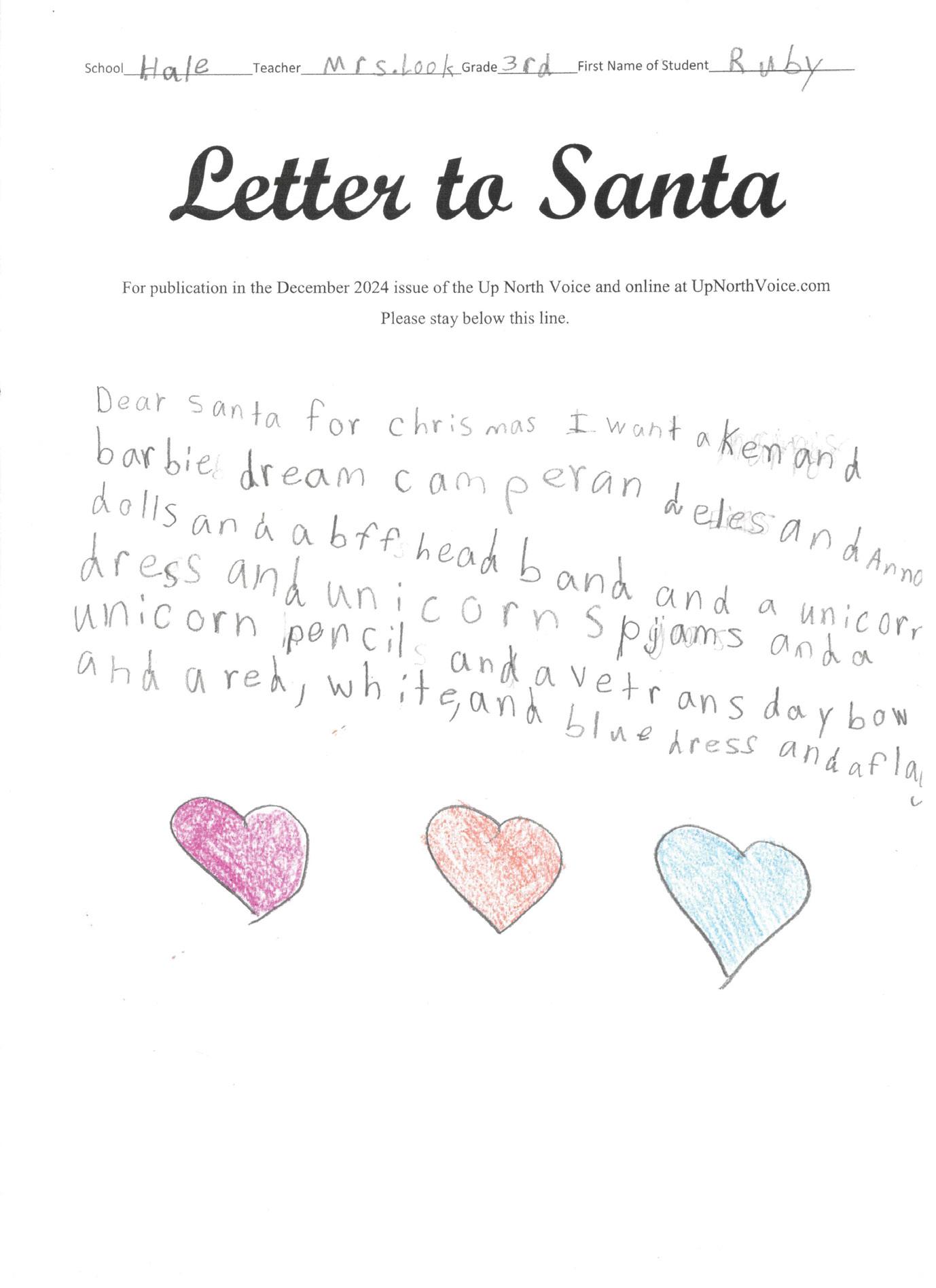 Dear Santa I want a new dollhouse for Christmas and a pink van. And a toy with furnucher that comes with it, part and lots of rooms with bathrooms too! With a peln and a blanket to and windows. I also want a basement. Can you say hi to my elf for me please. And a lamp that can turn on with a coutch and staris Love, Trinity