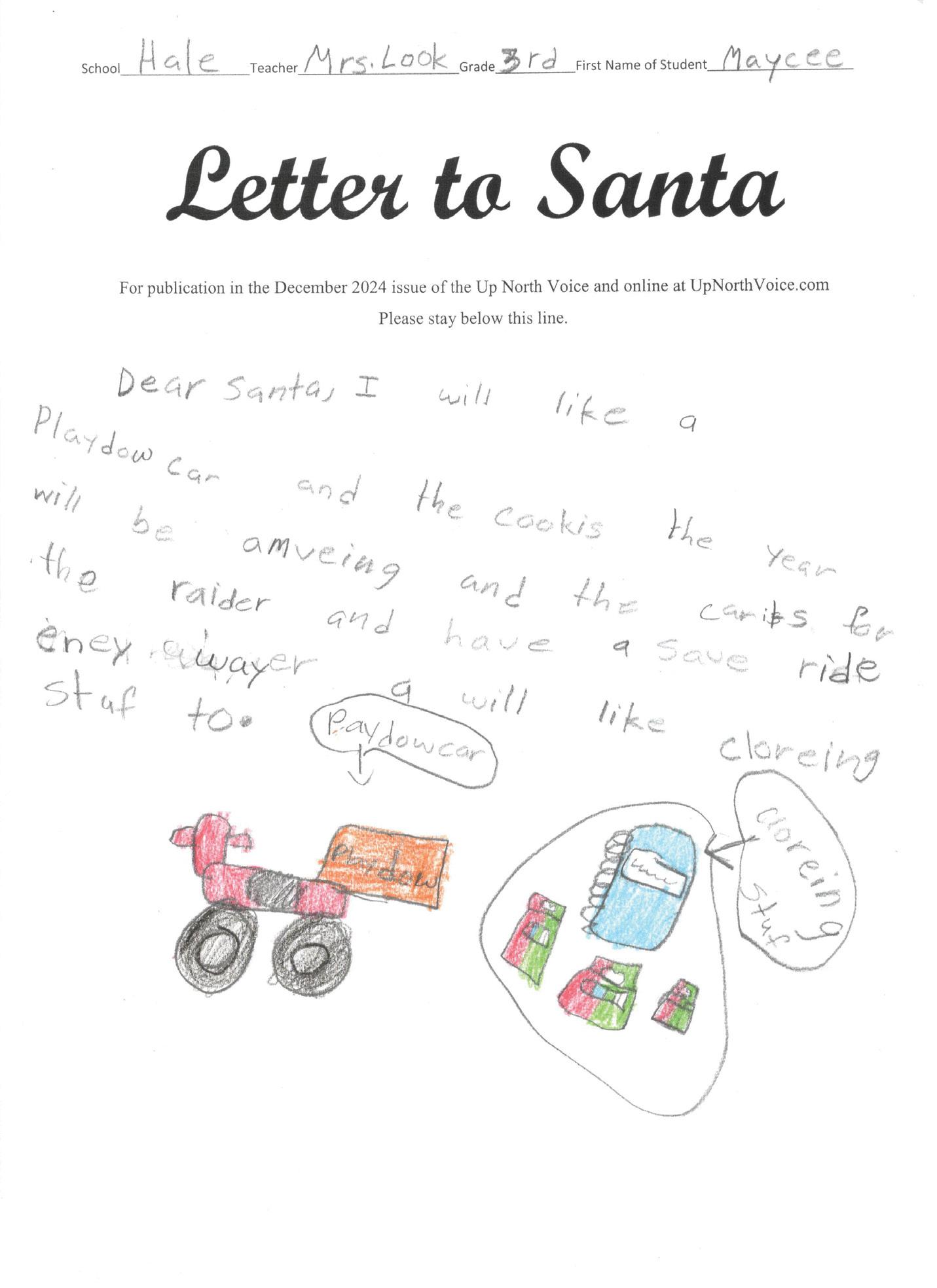Dear Santa Can I have a PS5 and the fort night disck and grave digger tanck and you will have lost of cookes Love, Breylan