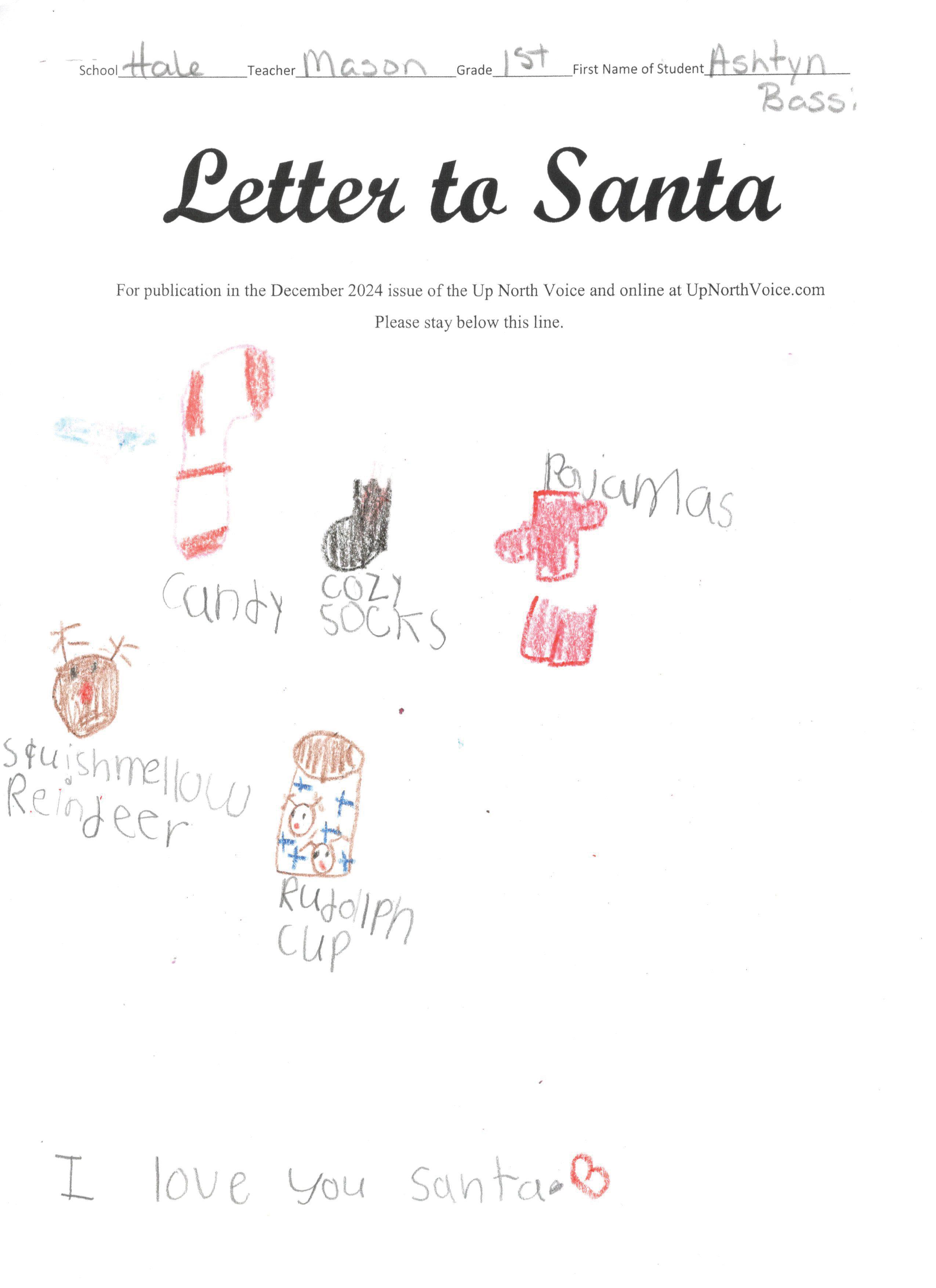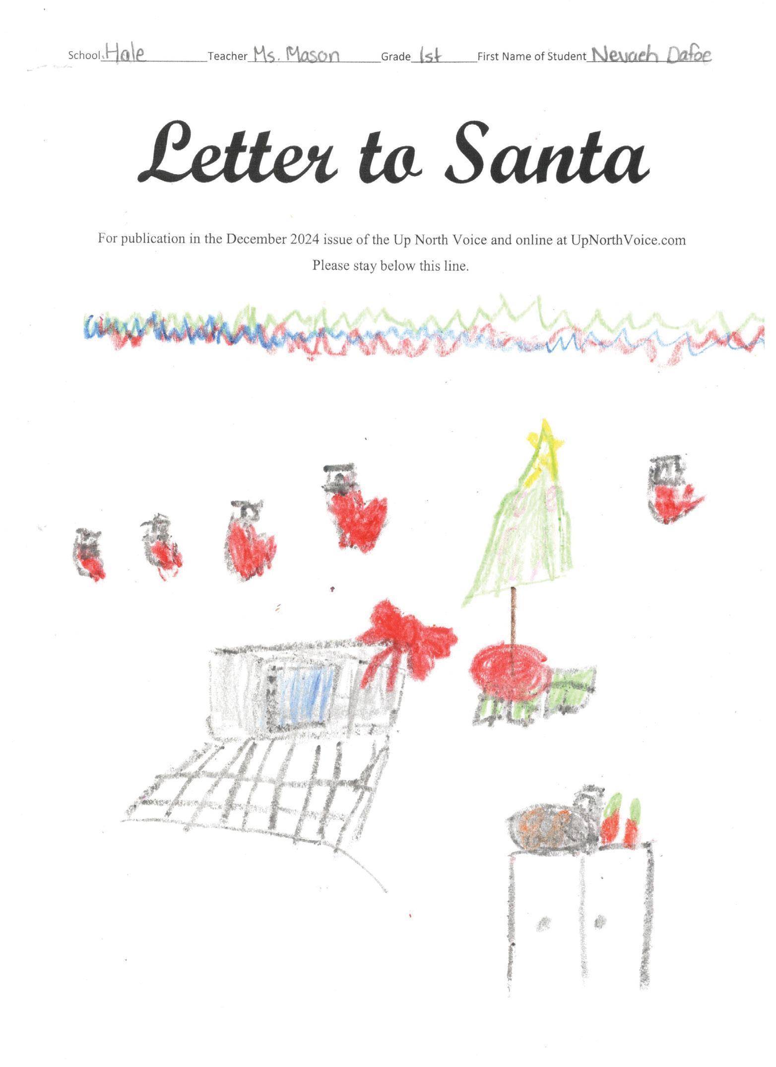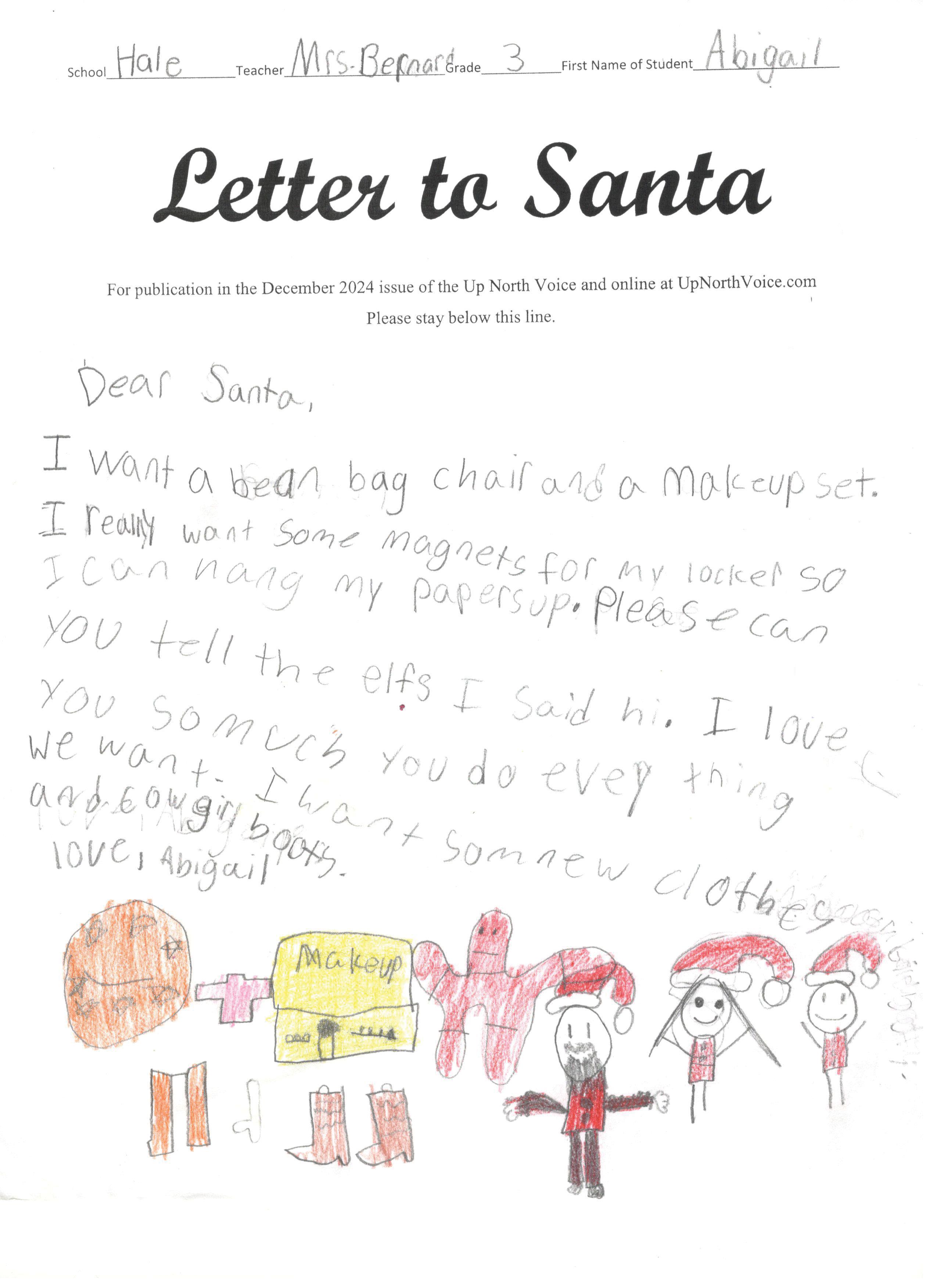 Dear Santa I want skincare and a new landyard. I want a new calendar and 2025. I also want uggs and chuck taylor converse. I want a babby doll bouncer and dress. I want new nikes, bookbins, posters and countaners for my pens. Can you please say hi to the raindeer for me? I have been trying to be good.