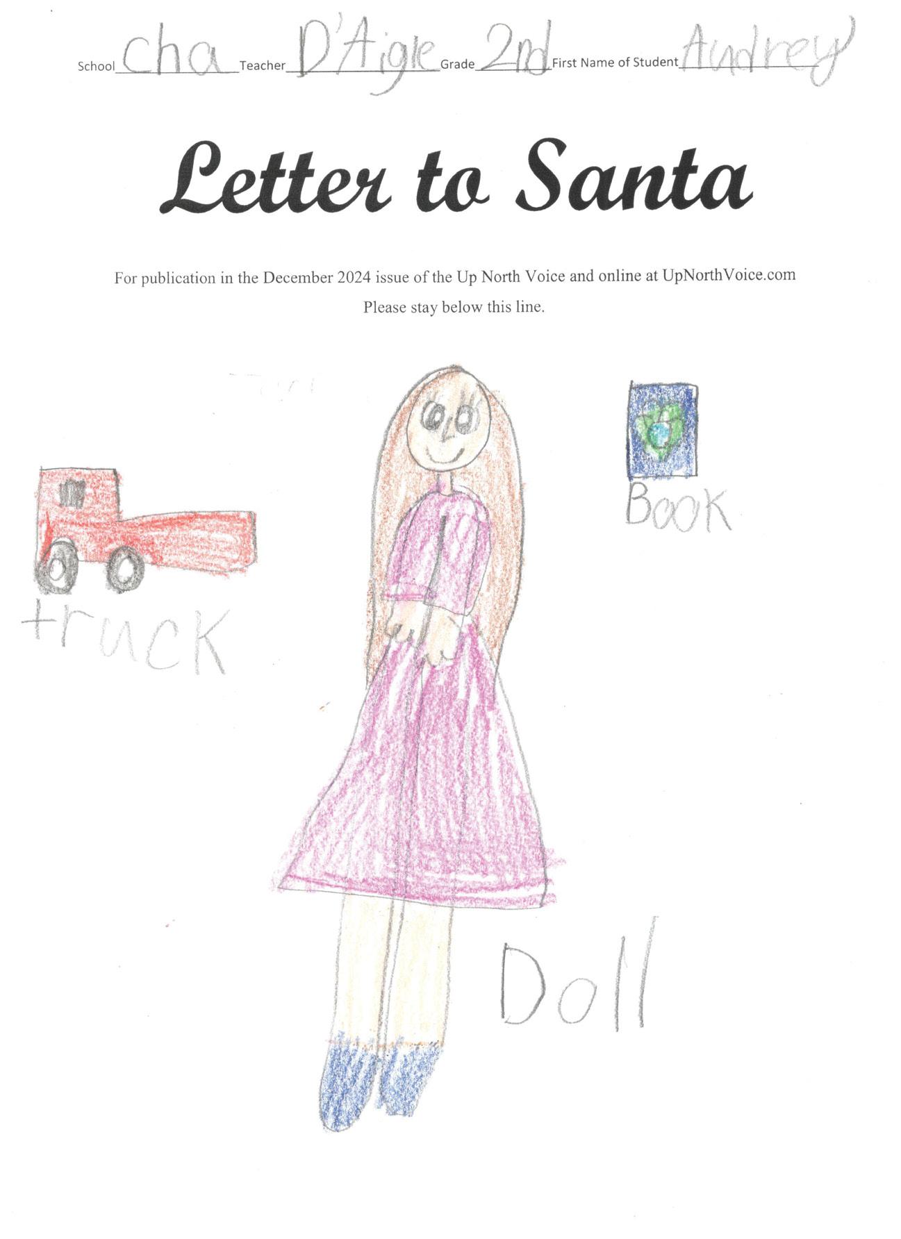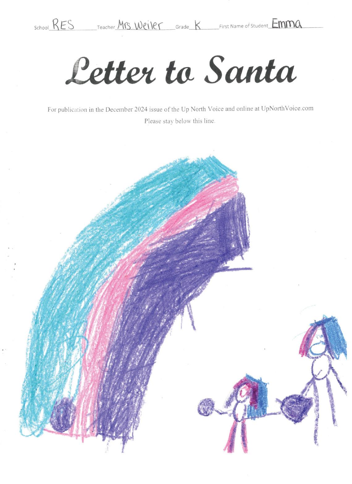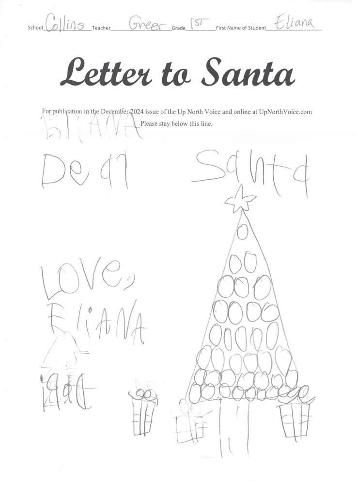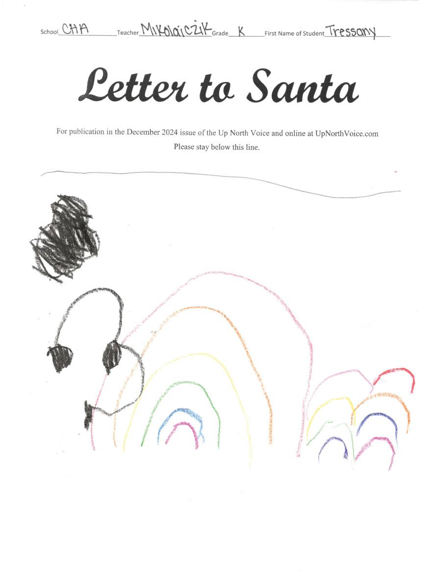 How are you? I have been working extra hard this year. I have been learning a lot! This year it would be cool if I got a laptop, a trampalen, and more decoratrens for my room. Thank you for the elf I could touch, I loved it!