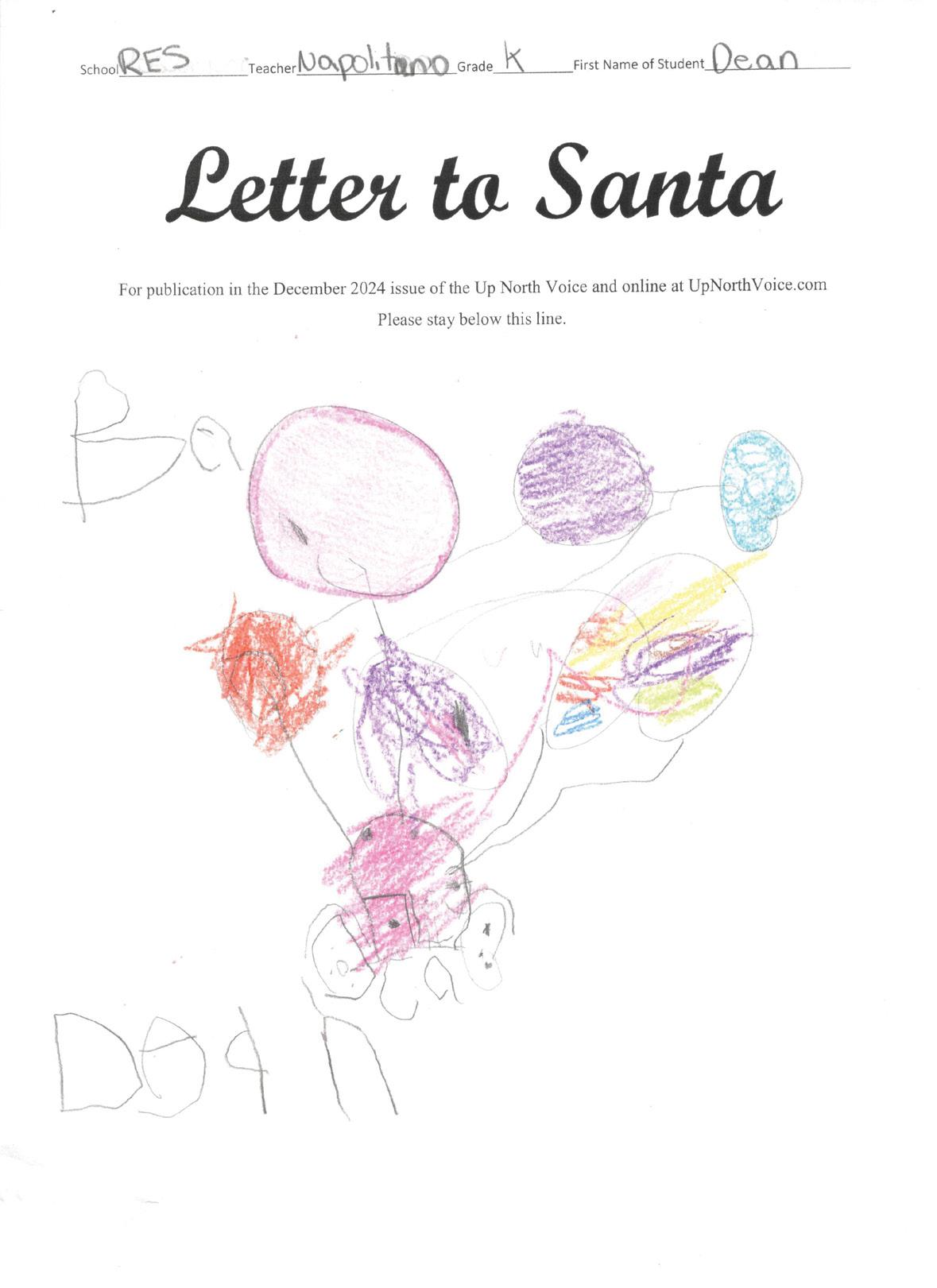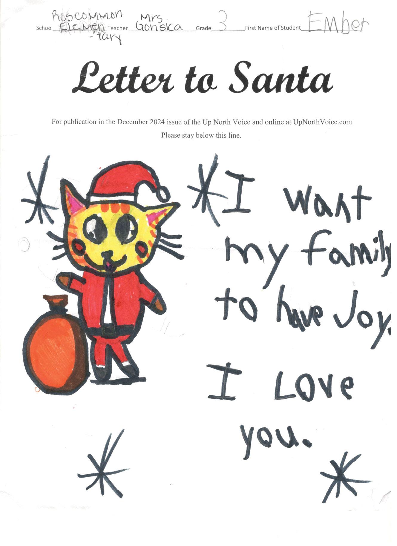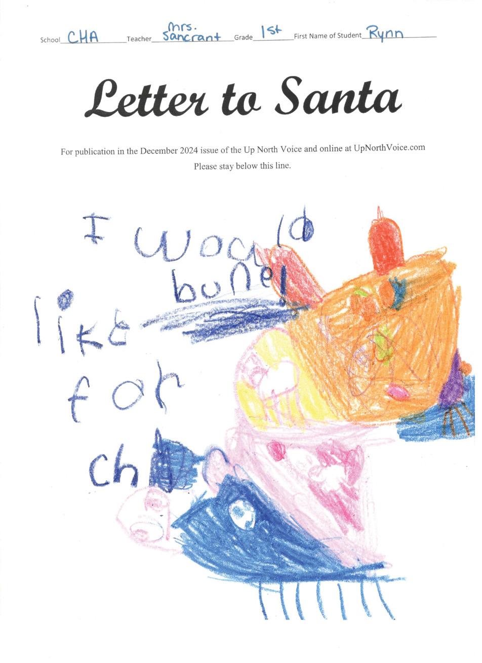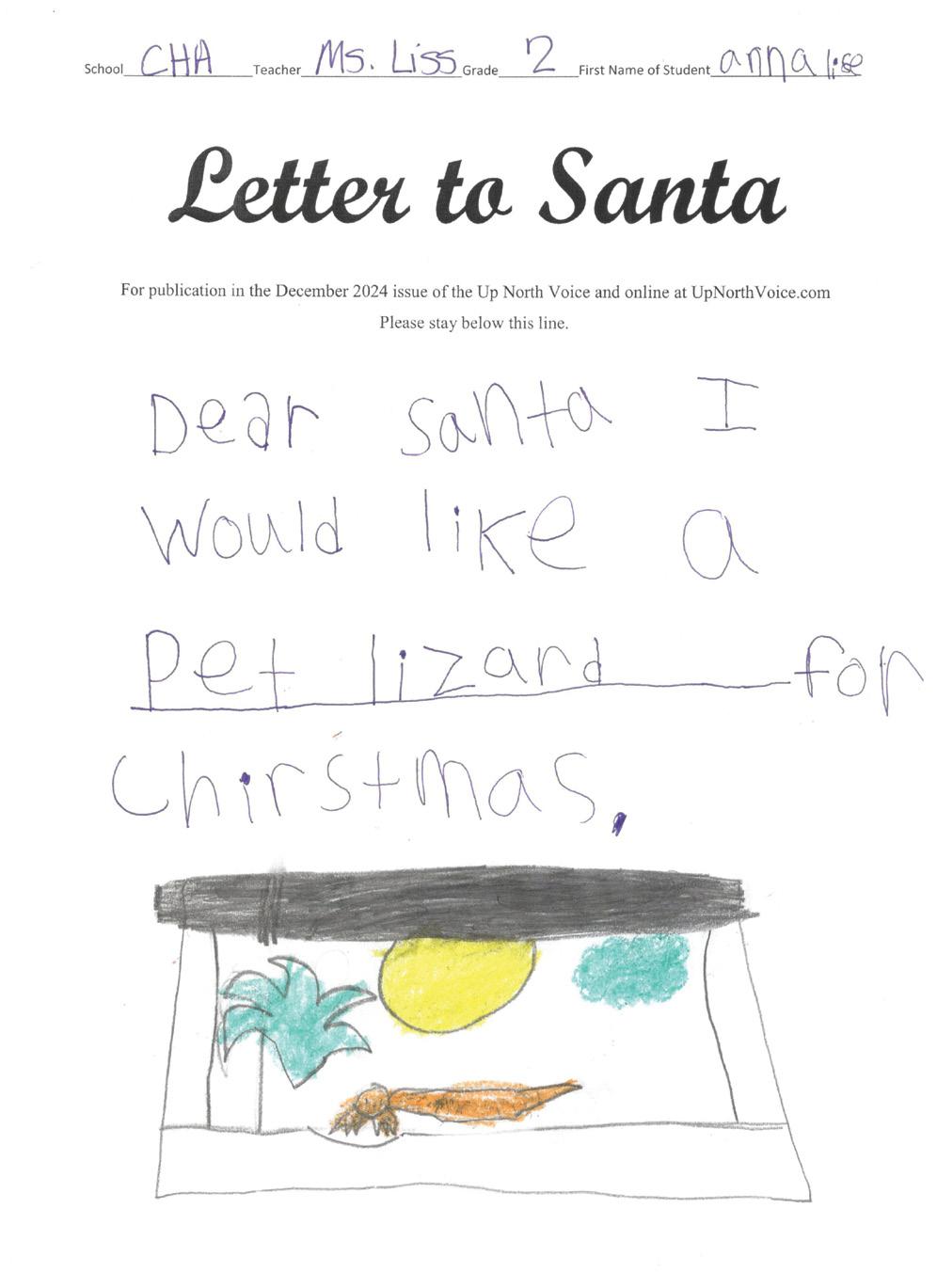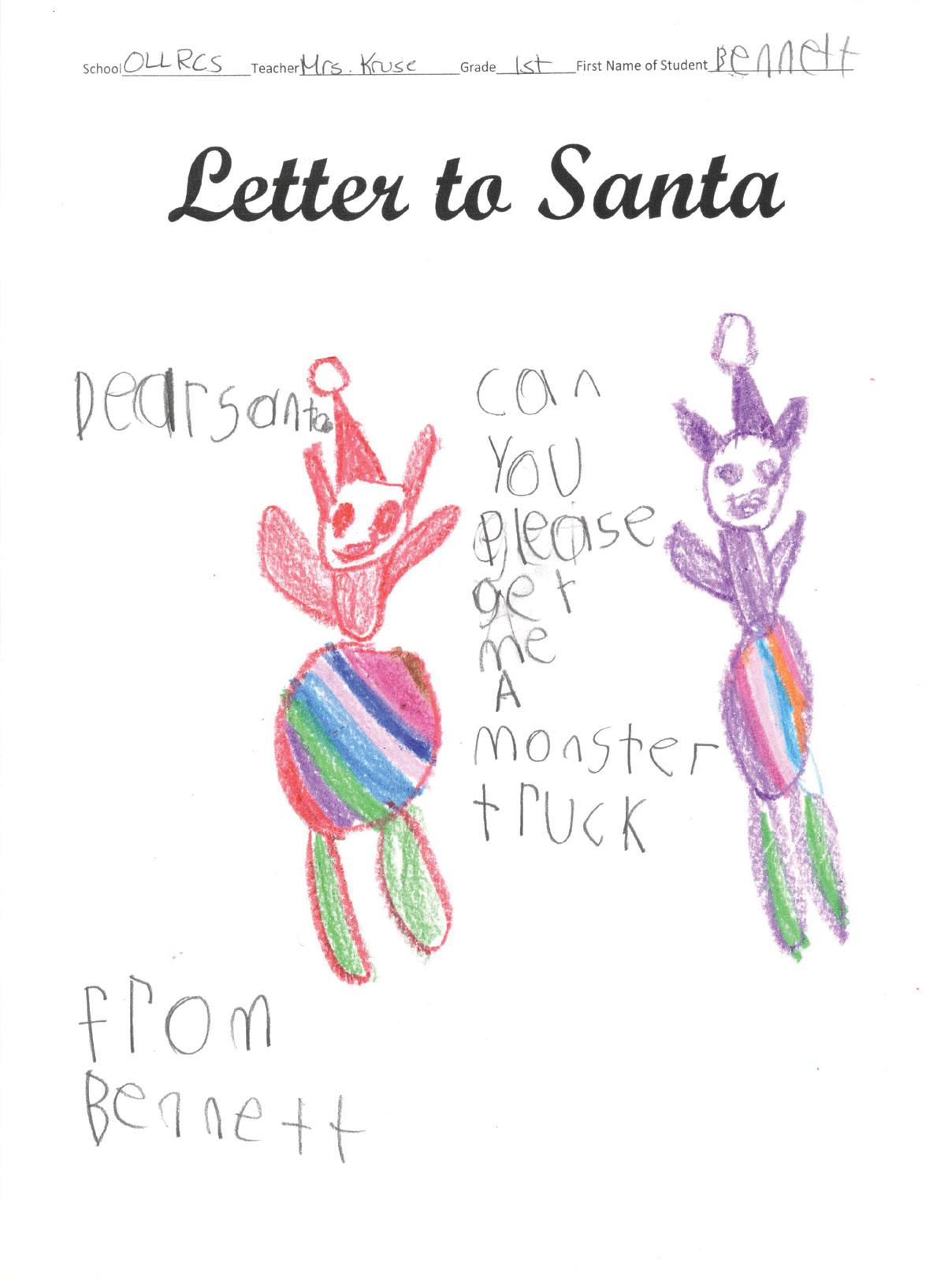 Dear Santa I wont a car. I wond my eerperst. I wont a cat and a dog an I wont u lot of candy plas Love, Reese
