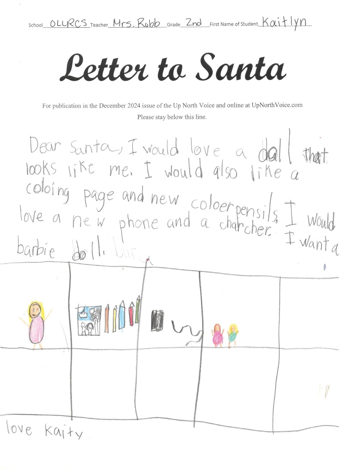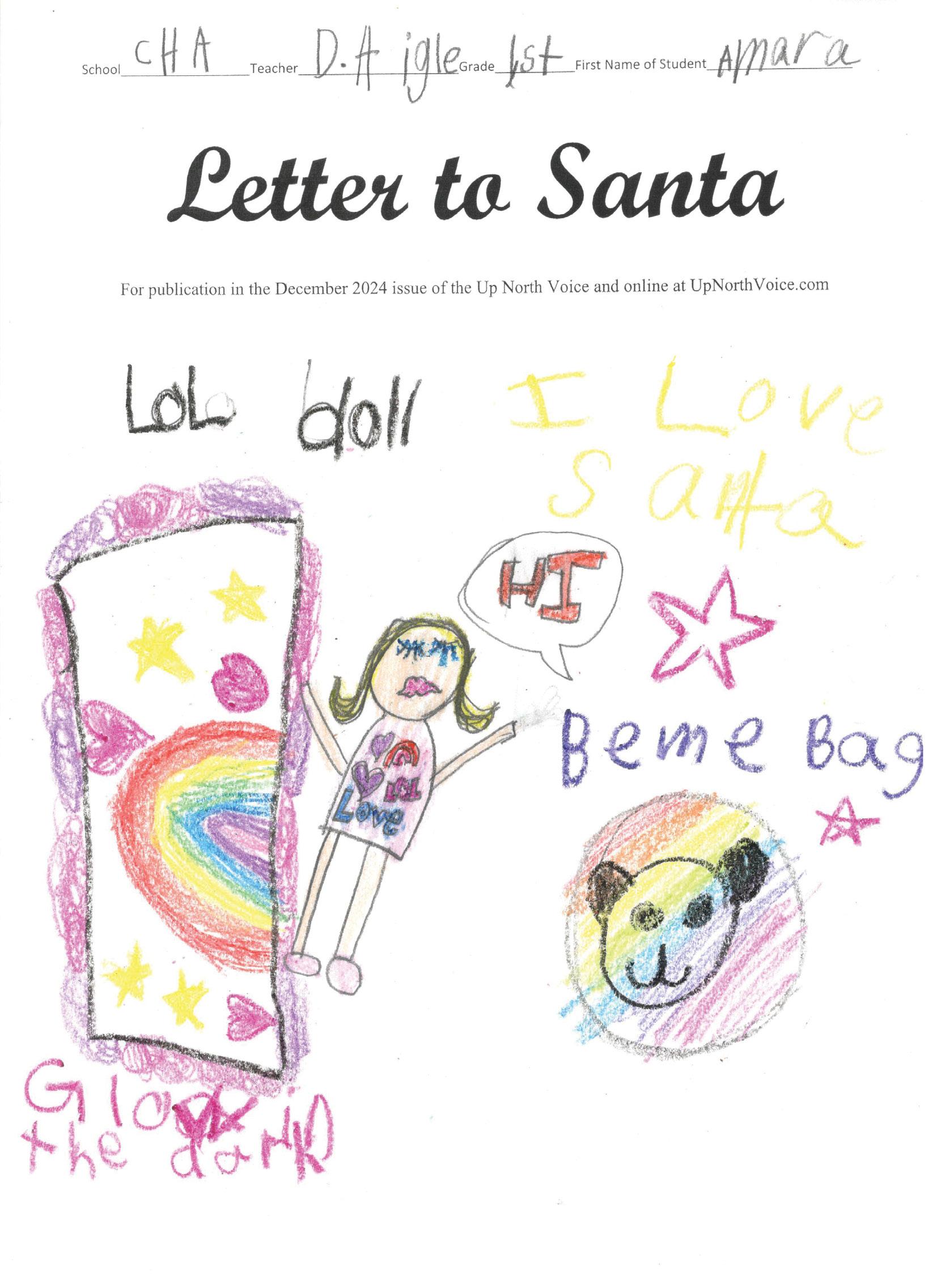 Dear Santa I want for Christmas more barbie stuff and barbie dolls. Plushie any plushie robux giftcard pop it, gumball machine, blank paper, color pencils, tape, cat headphones, tv, fake food, scooter Love, Matayah