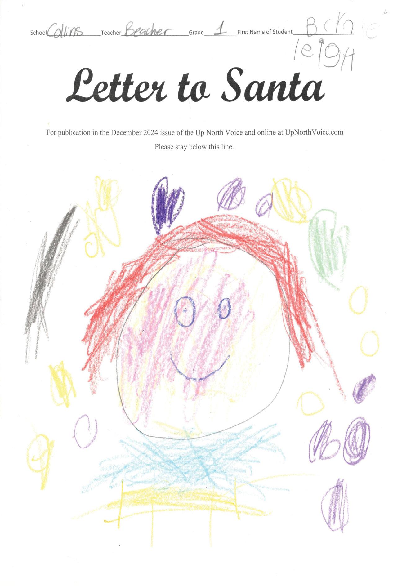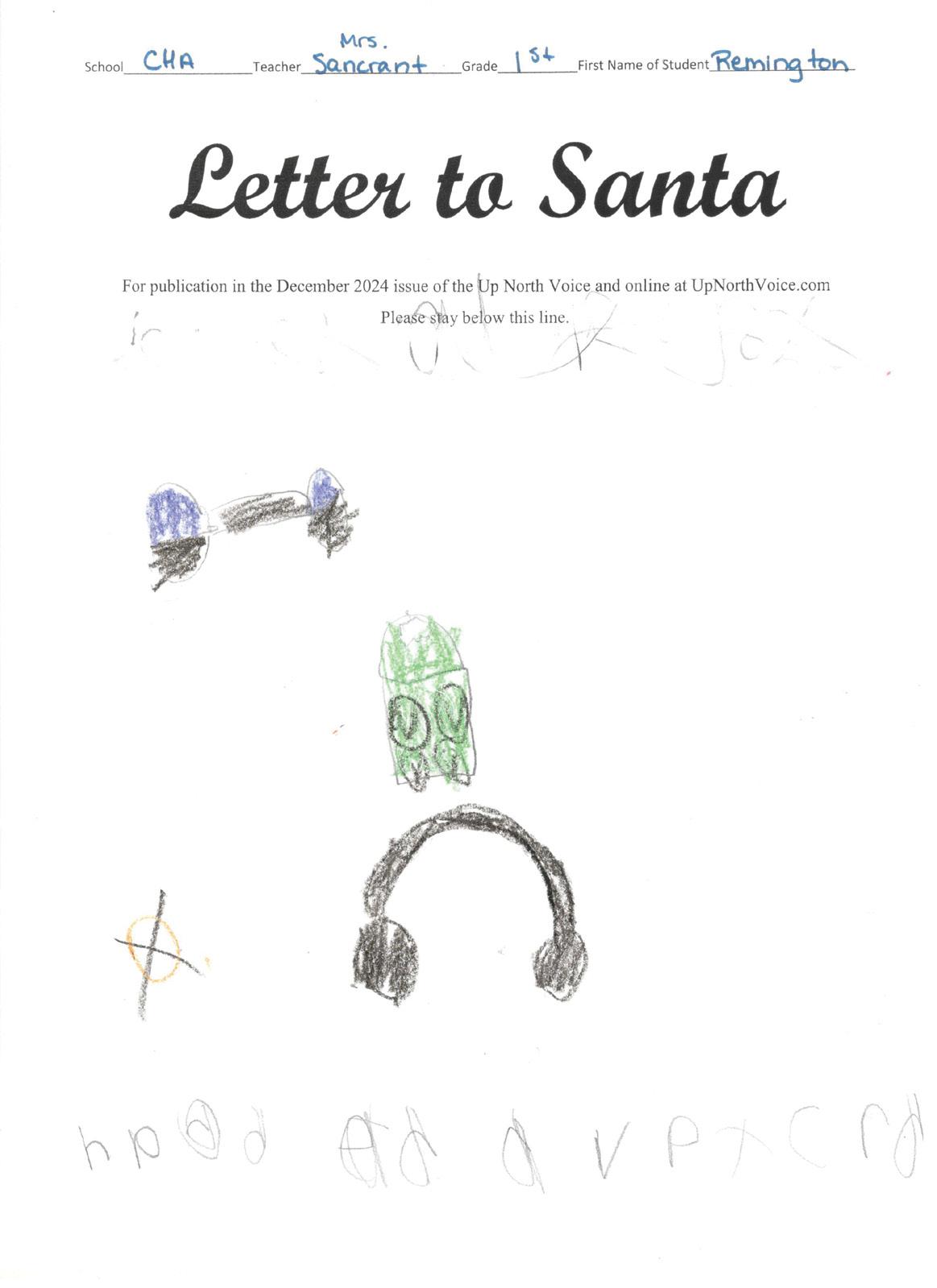 Dear Santa This year I would like a mini fridge and pop and a vr and a vr gift card and a bed couch. Love, Bently