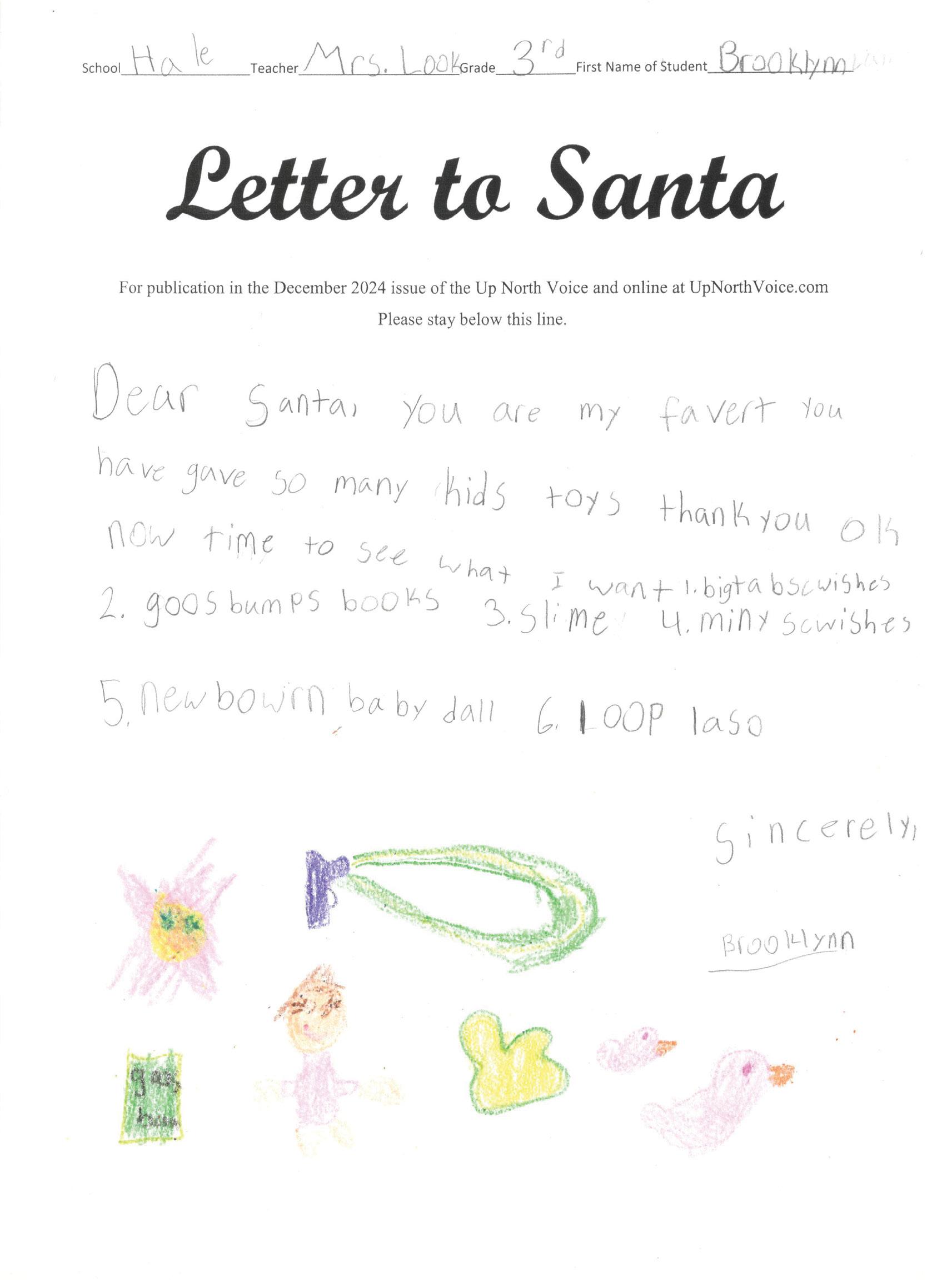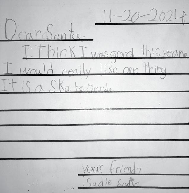 Dear Santa I want skincare and a new landyard. I want a new calendar and 2025. I also want uggs and chuck taylor converse. I want a babby doll bouncer and dress. I want new nikes, bookbins, posters and countaners for my pens. Can you please say hi to the raindeer for me? I have been trying to be good.