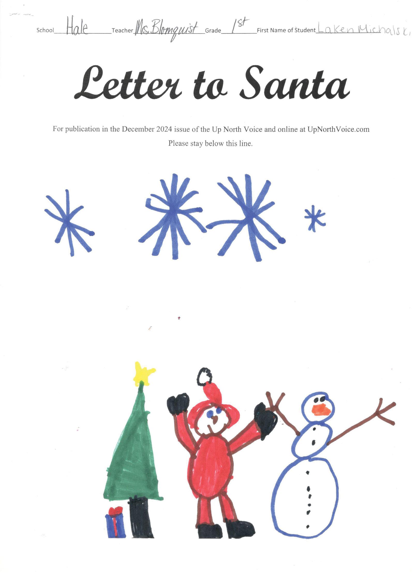 How are you? I have been working extra hard this year. I have been learning a lot! This year it would be cool if I got a laptop, a trampalen, and more decoratrens for my room. Thank you for the elf I could touch, I loved it!