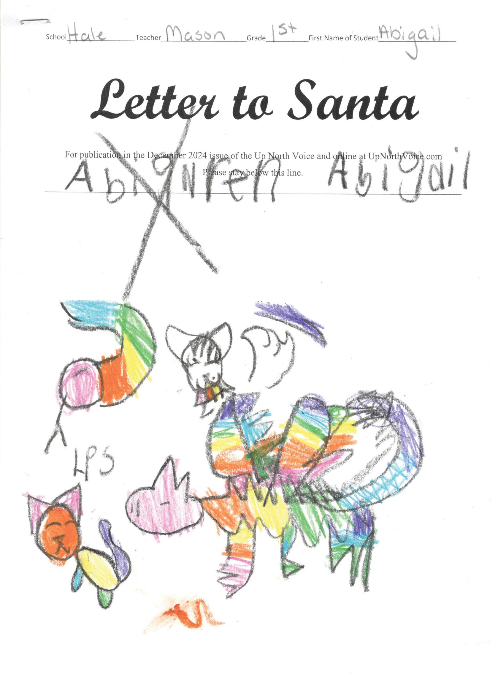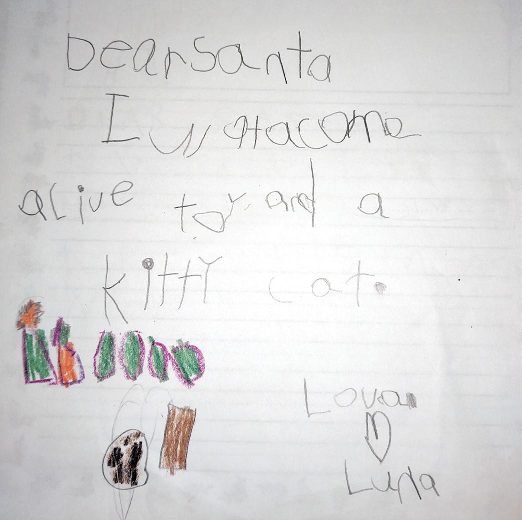 Dear Santa I wont a car. I wond my eerperst. I wont a cat and a dog an I wont u lot of candy plas Love, Reese