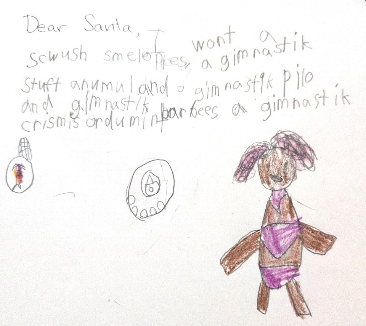 Dear Santa I want the epesods of onse upon a time 123456 and 7 an a anteno swich and a real bunny whith white fur and a phone and a mona costume and a gabbella costume and a combuter and a wach with games on it. And a preincess bag and the last one is a chaper book with preincess in it