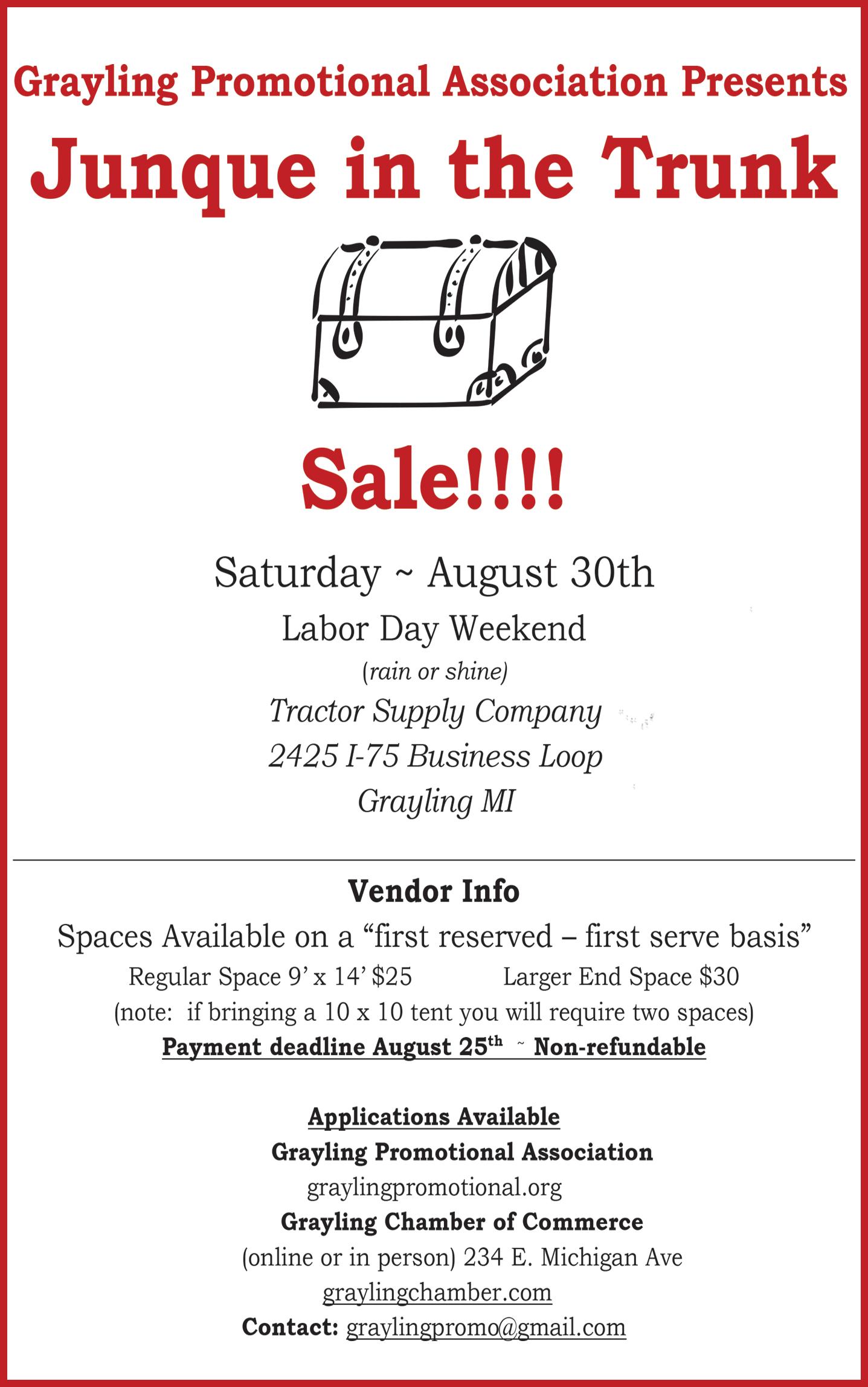 Their famous “Meatloaf Dinner” is available for $6 from 12 -1 p.m. and trophies will be awarded at 3 p.m. New this year is the Roscommon Center’s “Junque in the Trunk” sale. It’s happening at the same time, in the same location. Call 989-366-0205 to reserve your spot at the sale.