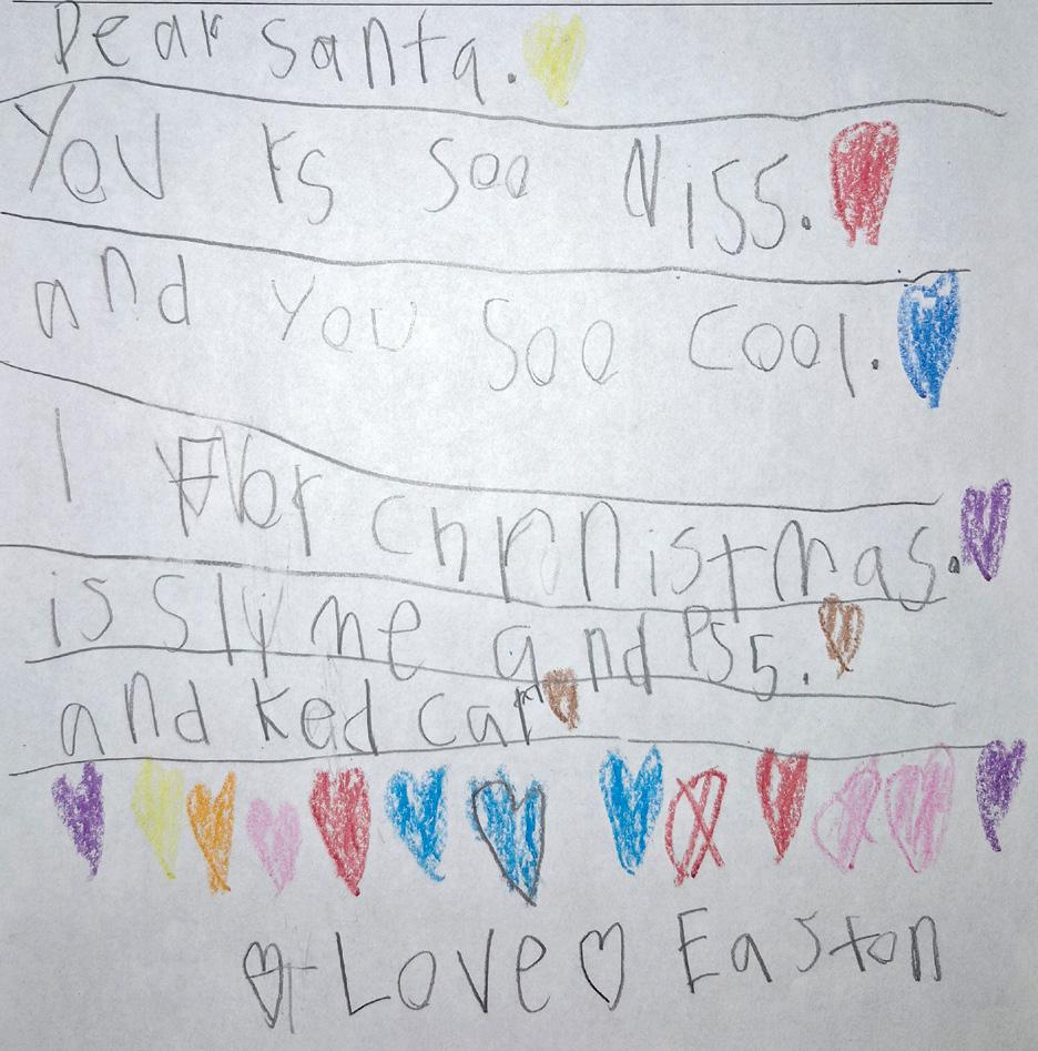 Dear Santa I want a monster truyck that is big and mak in crool Love, Levi