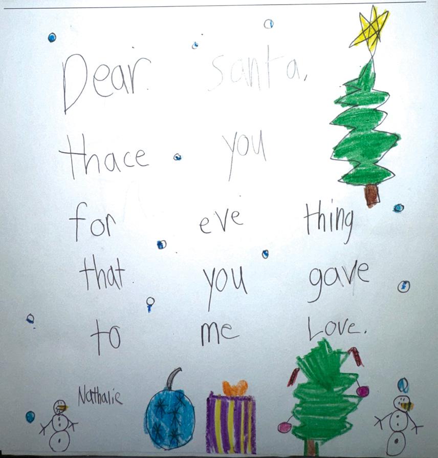 Dear Santa Am I on the good list? I want a present for my sister is a gymanistic suite bar and for me I want a kitchen and it comes with food with surprise. Love, Elanore