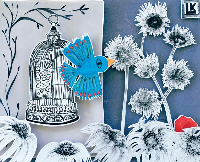 This piece depicts a garden full of colourful flowers fronting a row of houses where a bird, butterfly and bee flutter about. The collaged pieces are enhanced with a variety of pattern and lots of colour, using acrylic paint pens. Whimsy, to me, is the expression of lots of fanciful patterning and bright colour combinations, exuding elements of fun, playfulness and joyfulness. It definitely brings a smile to your face.