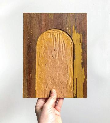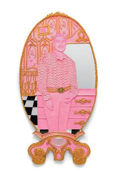 Metal leaf and acrylic paint applied to back side of glass mirror, gelatin size, MDF