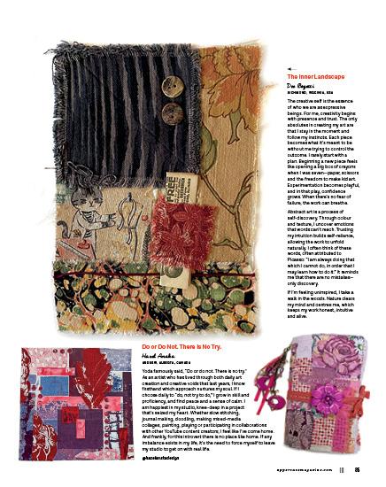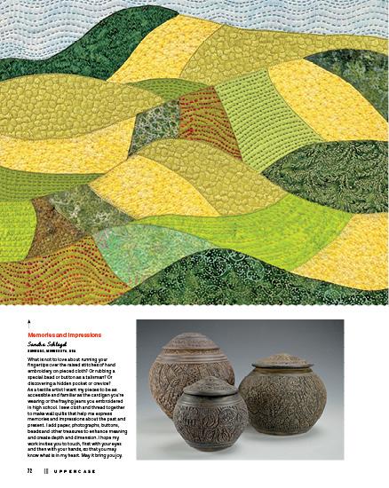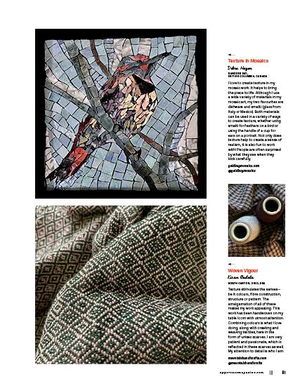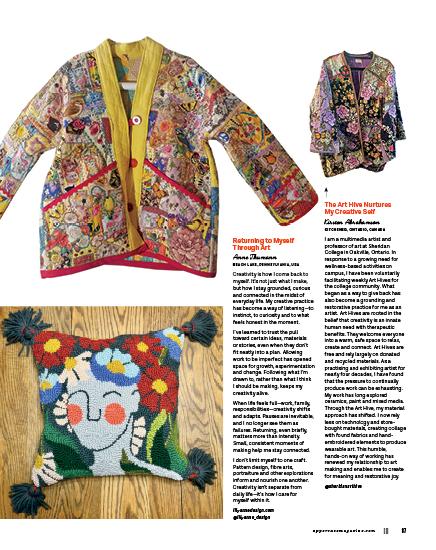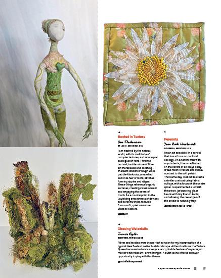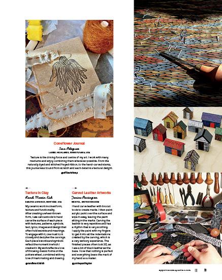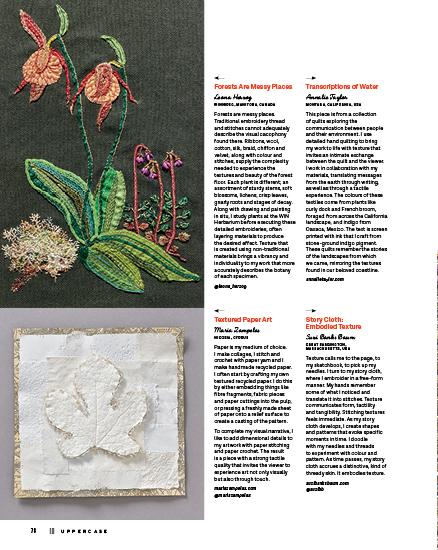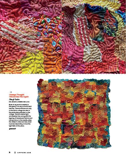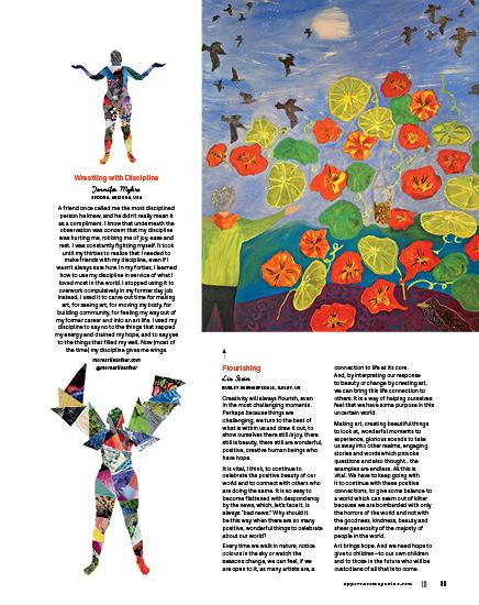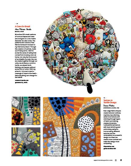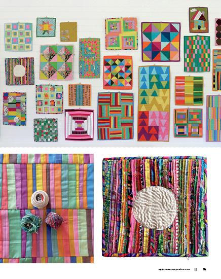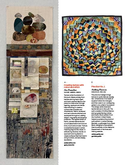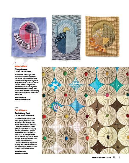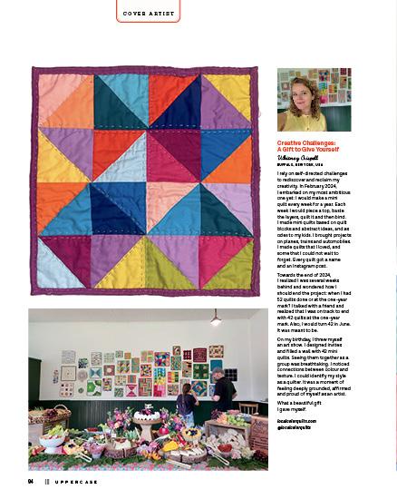 This issue’s cover artist, Whitney Crispell, set out to rediscover her creative self with a self-imposed challenge to make a mini quilt every week for a year. Old-fashioned blocks, contemporary designs and textural explorations inspired these small, quilted sketches.