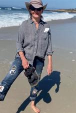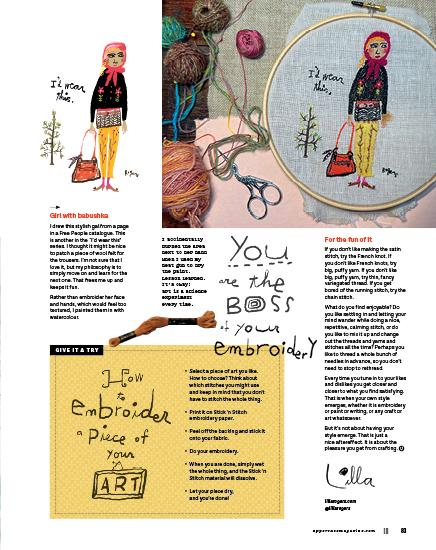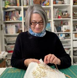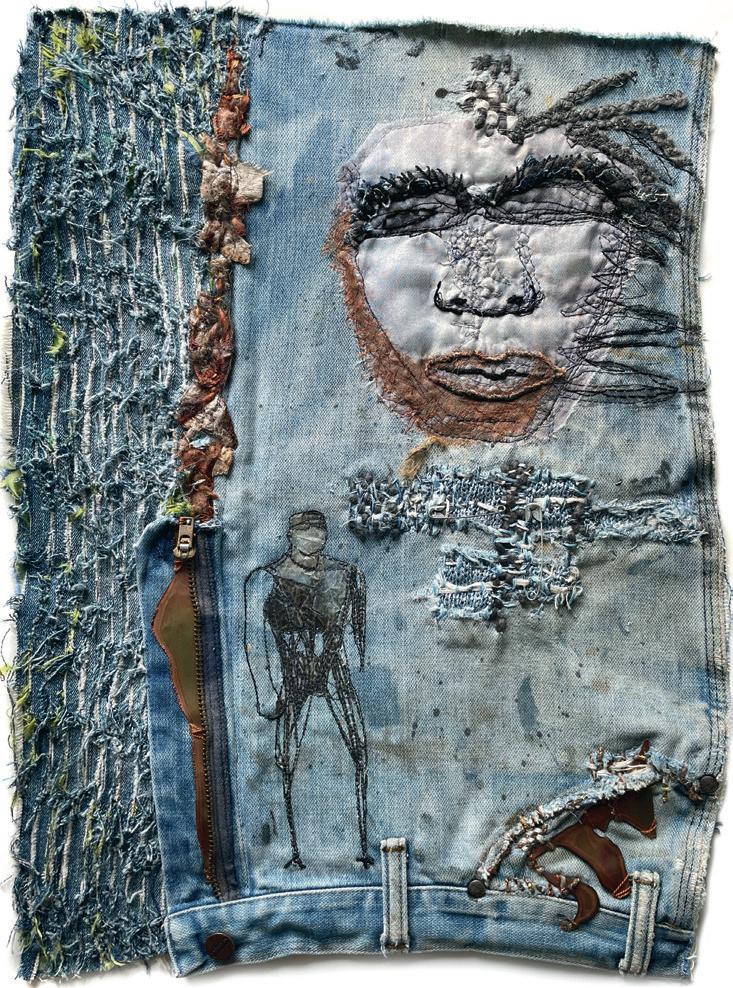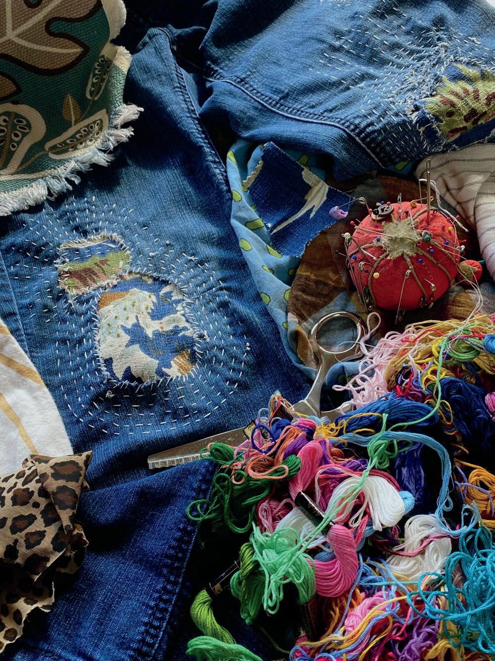 My grandmother taught me how to embroider when I was four. It was the early 1950s; we didn’t have TV or a phone. The country was still reeling from the Second World War, and things were sparse. My mom and grandma made rag rugs, quilts, our clothes, embroidered bed linens. Everything got recycled. I didn’t realize we were doing it out of necessity! I thought it was for fun. If I got a new dress, my doll also got one from the scraps. These jeans started out with a hole in the knee, so I patched it. As parts wore out, I’d mend them. Now it’s for the simple joy of creating. I know my upbringing plays a large part in that, and I am grateful. I still love to reinvent! I never have a plan. I just rummage through my bins of scraps until something seems right and then I go where it takes me. It’s collaging with fabric!