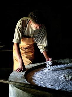 In addition to a visual inspection, feeling the pulp allows the papermaker to know how far the refining process has progressed.