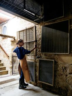 The felt and sheets are hung on racks in a drying room. Depending on the weather, drying can take from three to six days. In winter, when humidity slows the process, the mill uses a unique electric drying room built by Duchêne to control heat and airflow.