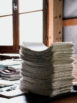 The wet sheets are transferred onto a wool felt, building up alternating layers of paper and felt— a rhythmic motion requiring precision and care. When a pile of around a hundred sheets is ready, it moves to the press.
