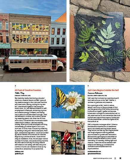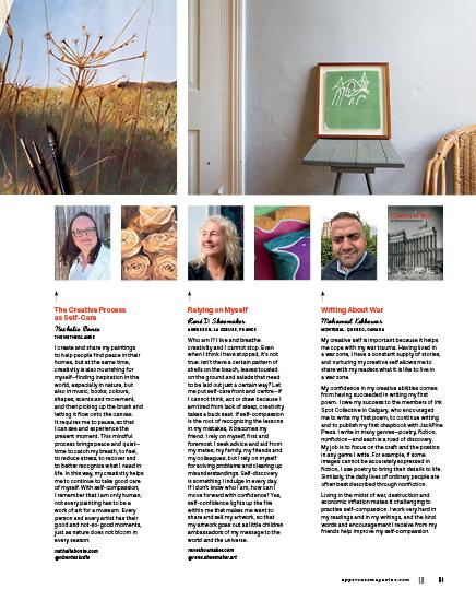 Although we’re looking inward in this issue, it is not selfish to nourish one’s creativity. Compassion, generosity and care for ourselves is necessary so that we may also extend it to others.