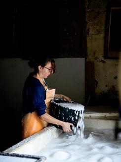 The cotton fibres are mixed with water in a large vat and crushed in a Hollander beater, a metal cylinder that transforms the mixture into a smooth pulp over several hours. Four to 14 hours of refining time— depending on the desired result—are necessary to obtain a homogeneous pulp. “The first step is the hardest,” Carole says. “It can take up to 14 hours, and it decides the quality of everything that follows.”