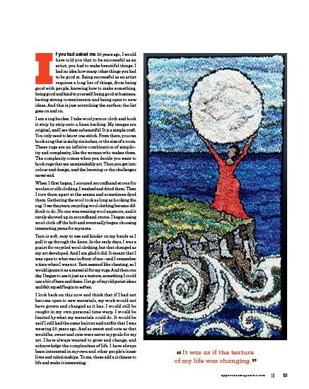Now when I look at my older rugs, I see one story, while my current rugs tell me another. If I had not begun using new materials, I might have lost interest in making rugs. Every time I introduce a new material, or a new colour combination, I am opening up possibilities. It gives me new ideas and experiences in making. And I try to carry this into my life, staying open to new people, new ideas, new activities. These add texture to my life; they bring interest, wonder and beauty to my everyday life—because art and life are like two strands of wool twisted together into a single yarn. I need to remain confident and curious, and let myself change and grow in art and life. This takes love and self-compassion to understand that it is okay to let things go, to set aside the old for the new, to unlock doors and let the wind blow through them. You have to rely on your instincts to know when and how to change. There is no clearly defined set of directions, just the map of your heart and the beat of your art. Follow that.