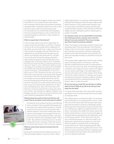 nights, Quilt Sunday or a trunk show. Witnessing the relationships that have grown within this space make me feel like the workroom is truly a positive part of people's lives. Of course, there is also that very special moment when someone finishes a project in class and they are filled with delight and pride. Helping this spark of creativity grow in people is incredible. As a business owner, you are responsible for many tasks from stocking inventory, customer service and marketing. Do you have assistants? How do you manage your time to allow for personal creativity? When I first opened I worked alone and did (or tried to do) everything myself. That was really hard. One of the best things I've done is to hire help. I've got a wonderful trio of girls who help me immensely in the shop. Having other people around makes the business more productive, the days more enjoyable and helps me remember to stop and have lunch! Some people might imagine that I spend my days crafting away in the shop, but this is not the case. I don't usually allow myself that free time while I'm at the workroom. There is too much work to be done. One of the big reasons I decided to start a blog was to force myself to not neglect my own need to make things. It has really helped me to examine and to share with a wider audience all the things I do that are creative, whether it is cooking a new recipe or learning how to hand quilt. Having an audience motivates me set aside this time for myself and to honour all the things I make, no matter how small. Do you live near your shop? Do you also have a crafting space at home? What do you like to do with your time away from the shop? I live quite close to the shop. Since I knew that I would be spending so much time there, being close to home makes my long days easier. My crafting space is my dining room table. I've never had a permanent spot for my sewing machine at home. I think this is one of the reasons that I felt having an open studio space like the workroom would be so appealing to people. Most people don't have that kind of space and often times your crafting space might be secluded somewhere in your house. I love being in the middle of the house, close to the kitchen and the television. Some of my favourite nights are having the television going late into the night while I work on the sewing machine. I haven't had a lot of free time since I started the business, so I often find myself on my laptop when I get home to try and get more work done. One of my goals for myself this year is to start giving myself more time off. I really love gardening and I didn't spend that much time with my garden last summer. To be honest, as soon as I finish this interview I'm going to jump on my sewing machine and make a new smock top from one of my Japanese craft books.